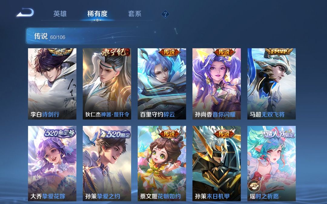 本游戏账号: V10用户,基础段位:至尊星耀V,英雄多,皮肤多。典藏皮肤6个,感受典藏皮肤带来的优质体验快感,FMVP皮肤5个,尽情享受FMVP皮肤带来的主角光环, 私人所属英雄皮肤有:诸葛亮 星域神启||虞姬 神鉴启示录||韩信 弑枪猎影||李白 鸣剑·曳影||夏侯惇 无限飓风号||芈月 大秦宣太后马可波罗 妄想实况||马可波罗 深海之息||孙悟空 地狱火||孙悟空 零号·赤焰||诸葛亮 时雨天司||司空震 愿照·山河定||狄仁杰 神器·狴犴令||狄仁杰 超时空战士||澜 愿照·九州拓||铠 绛天战甲||铠 冥王哈迪斯||虞姬 愿照·岁时盈||虞姬 启明星使||虞姬 云霓雀翎||孙尚香 乘龙·问璇玑||孙尚香 异界灵契||干将莫邪 画中仙||女娲 愿照·千秋盛||嬴政 玄雷天君||李信 山海·炽霜斩||李信 一念神魔||艾琳 觅芳踪||妲己 愿照·众生和||墨子 黄金天蝎座||鲁班七号 寅虎·瑞焰||不知火舞 绯月行||公孙离 祈雪灵祝||宫本武藏 地狱之眼||王昭君 映山客|