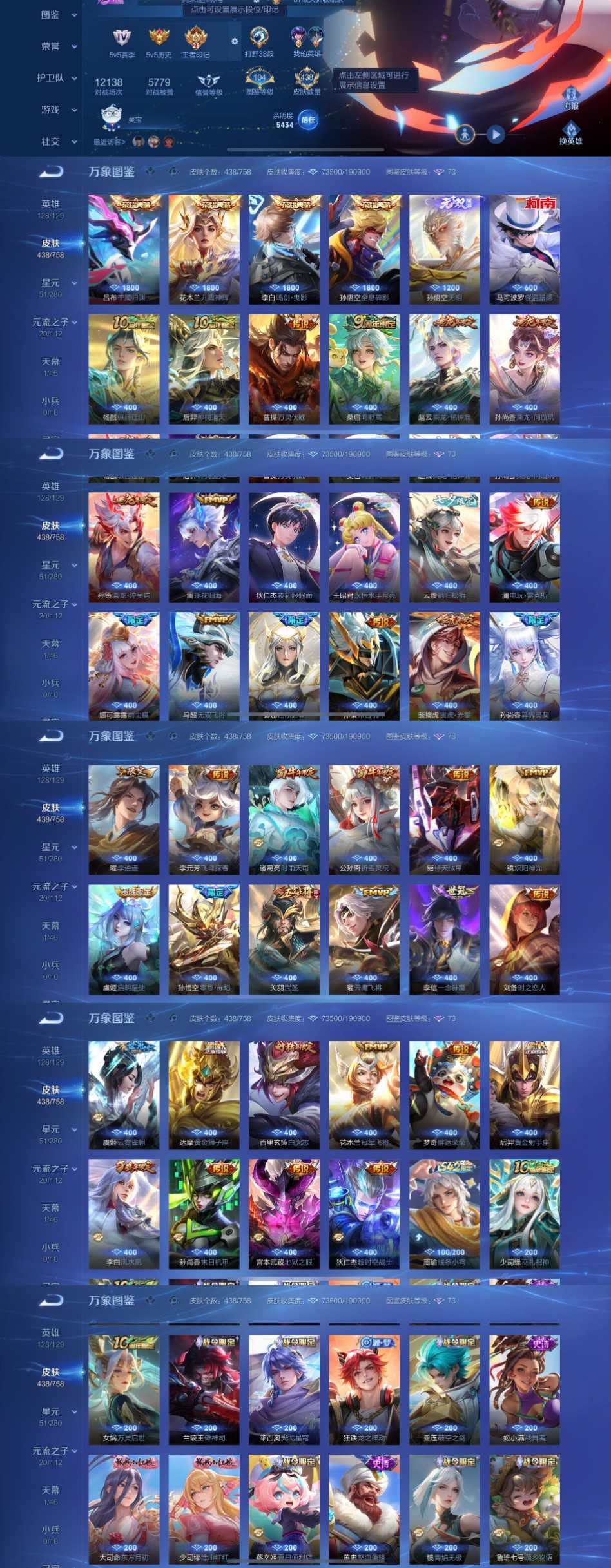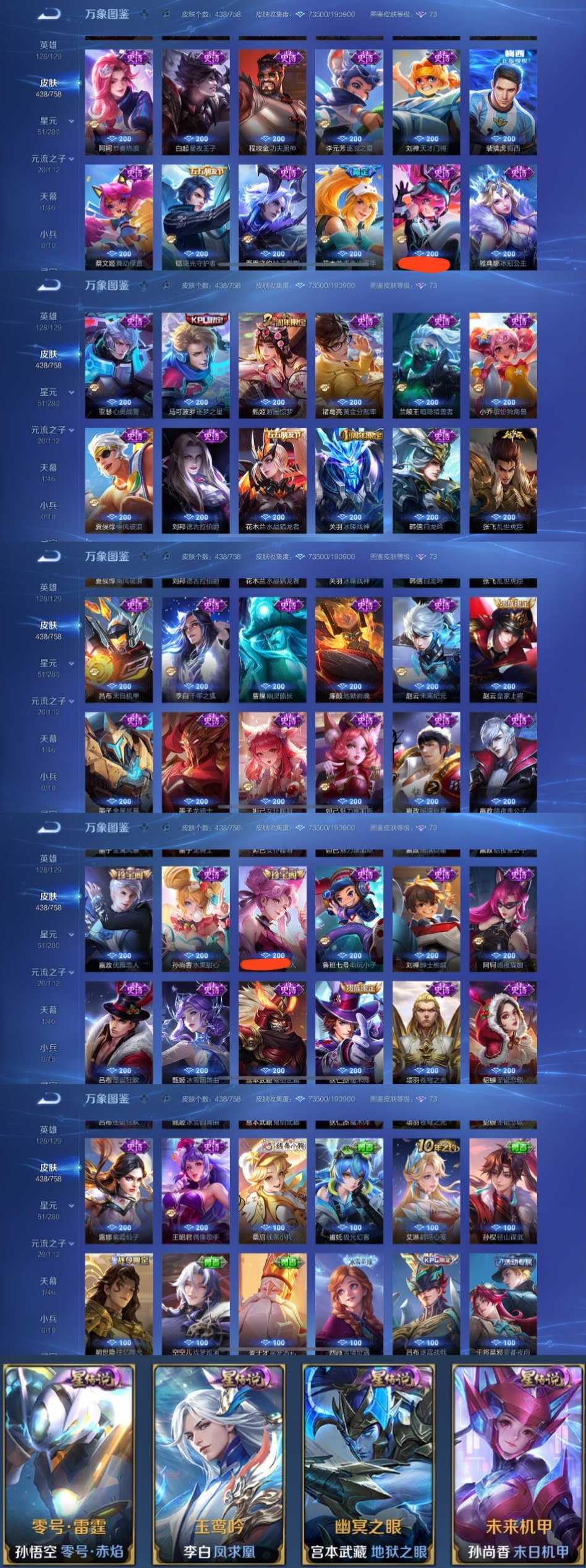 时间到了还登录白玩或者顶号全部改密拉黑处理永不解除,顶号机器会秒禁玩改密,顶号不仅拉黑还没得玩,赚三两块不容易,请理解谢谢。 ❤❤❤❤❤❤❤❤❤❤❤❤❤❤❤ 请勿开挂,挂机,送头,骂人,撤单后游戏等如有违规永久拉黑永不解除。 重置二级密码不要费劲了,号主每天都会上号查看,多行不义必自毙,人在做天在看,多做好事多自律,少做缺德事。 该号英雄128个皮肤438个,典藏4个,无双1个,珍品传说1个,星传说4个,传说40个,史诗137个,祝您游戏愉快~