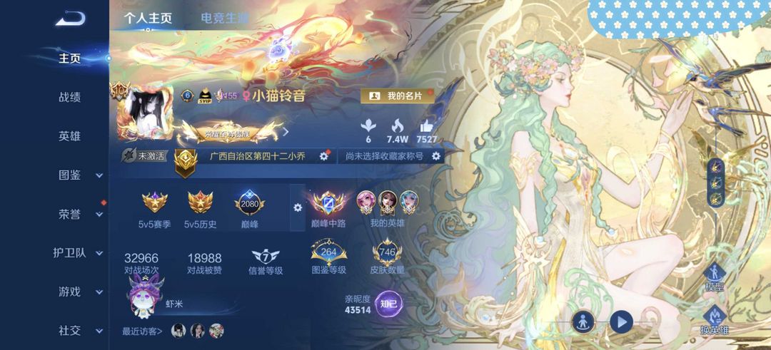 本游戏账号: V10无双贵族用户,基础段位:永恒钻石II,英雄多,皮肤多。典藏皮肤17个,感受典藏皮肤带来的优质体验快感,FMVP皮肤10个,尽情享受FMVP皮肤带来的主角光环, 私人所属英雄皮肤有:瑶 拾光映像||虞姬 神鉴启示录||程咬金 活力突击||孙悟空 全息碎影||关羽 赤影疾锋||韩信 弑枪猎影||貂蝉 幻阙歌||铠 银白咏叹调||花木兰 九霄神辉||诸葛亮 星域神启||芈月 大秦宣太后||夏侯惇 无限飓风号||鲁班七号 星空梦想||孙尚香 杀手不太冷||李白 鸣剑·曳影||武则天 倪克斯神谕||小乔 天鹅之梦,等等
