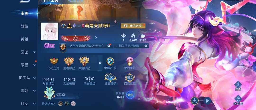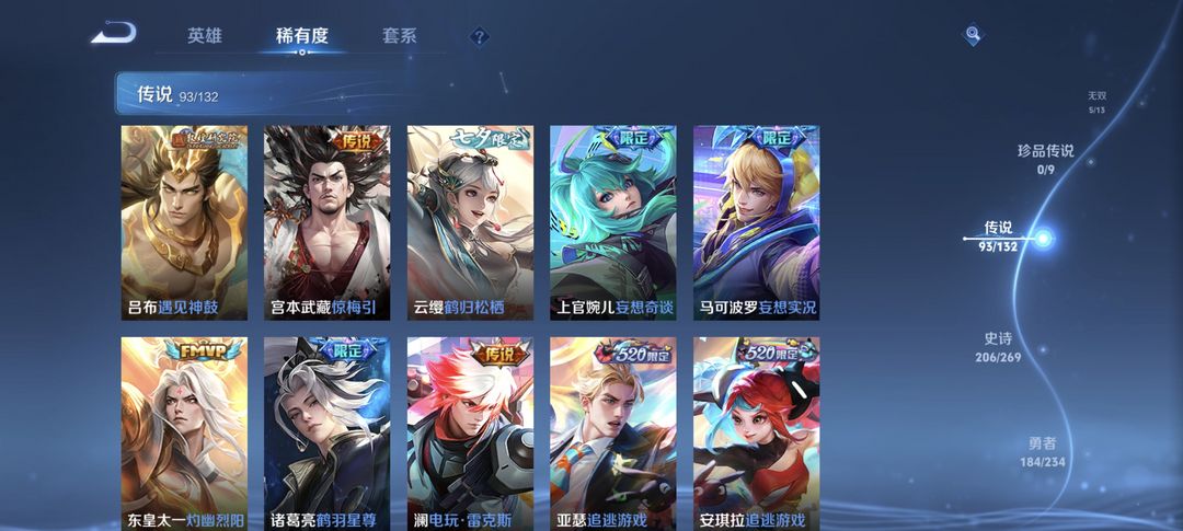 本游戏账号: V10无双贵族用户,基础段位:最强王者,英雄多,皮肤多。典藏皮肤7个,感受典藏皮肤带来的优质体验快感,FMVP皮肤4个,尽情享受FMVP皮肤带来的主角光环, 私人所属英雄皮肤有:武则天 倪克斯神谕||貂蝉 幻阙歌||花木兰 九霄神辉||虞姬 神鉴启示录||小乔 天鹅之梦||瑶 拾光映像||伽罗 最初的交响诸葛亮 鹤羽星尊||诸葛亮 时雨天司||大乔 时之奇旅||大乔 挚爱花嫁||铠 绛天战甲||嬴政 玄雷天君||公孙离 记忆之芯||公孙离 祈雪灵祝||孙尚香 末日机甲||孙尚香 异界灵契||鲁班七号 时之奇旅||鲁班七号 寅虎·瑞焰||孙膑 小动物乐团||嫦娥 器灵·落星盏||马超 琥珀纪元||澜 愿照·九州拓||桑启 鸣野蒿||夏洛特 浮生妄||司空震 愿照·山河定||云缨 幻光神枪||貂蝉 曦玄引||貂蝉 遇见胡旋||貂蝉 仲夏夜之梦||安琪拉 追逃游戏||露娜 启示之音||露娜 霜月吟||王昭君 映山客||王昭君 永恒水手月亮||王昭君 星穹之声||王昭君 乞