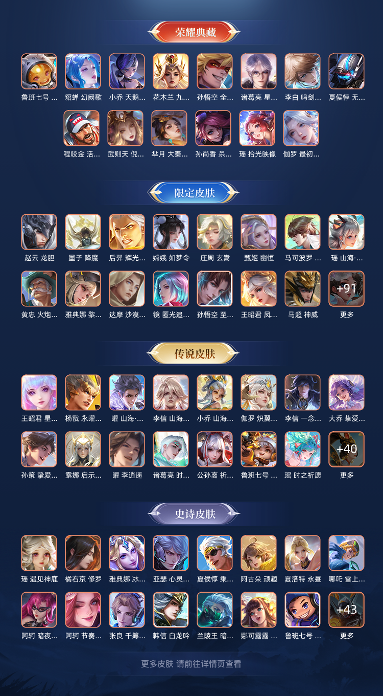 纯白花嫁/天魔缭乱/至尊宝/真爱至上/圣诞老人/梅西/白虎志/久胜战神/飞衡/愿照·九州拓/愿照·众生和/匿光追影者/鸣剑·曳影/愿照·福禄聚/无双飞将/时之祈愿瑶/挚爱花嫁/星域神启/李逍遥/幻阙歌/时之奇旅(孙策)/愿照·千秋盛/雪境奇遇(甄姬)/拾光映像/大耳狗之梦/深海之息/最初的交响/玉兔公主/补天/怪盗基德/愿照·岁时盈/异界灵契/神威/炽阳神光/启示之音/九霄神辉/云诺千山/愿照·山河定/傲雪梅枪/纯白花嫁/天魔缭乱/至尊宝/真爱至上/圣诞老人/梅西/白虎志/久胜战神/飞衡/愿照·九州拓/愿照·众生和/匿光追影者/鸣剑·曳影/愿照·福禄聚/无双飞将/时之祈愿瑶/挚爱花嫁/星域神启/李逍遥/幻阙歌/时之奇旅(孙策)/愿照·千秋盛/雪境奇遇(甄姬)/拾光映像/大耳狗之梦/深海之息/最初的交响/玉兔公主/补天/怪盗基德/愿照·岁时盈/异界灵契/神威/炽阳神光/启示之音/九霄神辉/云诺千山/愿照·山河定/傲雪梅枪