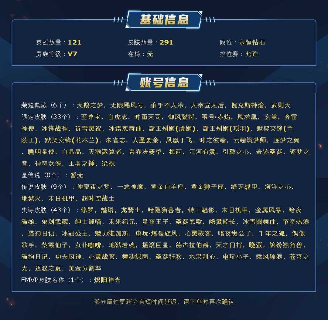 毁号,涉及毁坏虚拟财产罪及计算机安全罪,请文明游戏素质游戏,让我们共建美好租号平台 本游戏账号: V8用户基础段位:永恒钻石IV英雄多皮肤多。典藏皮肤3个感受典藏皮肤带来的优质体验快感 私人所属英雄皮肤有:孙悟空 全息碎影夏侯惇 无限飓风号小乔 天鹅之梦赵云 淬星耀世虞姬 启明星使吕布 天魔缭乱李白 凤求凰武则天 海洋之心后羿 黄金射手座杨戬 永曜之星诸葛亮 武陵仙君孙尚香 末日机甲孙悟空 地狱火等等 注意事项: A.游戏过程中请不要恶意挂机或者不文明发言B.恶意挂机、顶号等行为将被拉黑无法再次下单C.进入游戏后中途请勿退出登陆,否则无法再次上号D.部分账号由于异地登录可能会出现密码错误提示,通常再尝试5-6次后可上号。 喜欢本账号请点 ☆收藏☆ 方便下次租用,谢谢光临惠顾请游戏局内保持文明,防止禁言影响他人游戏,祝您玩得愉快!
