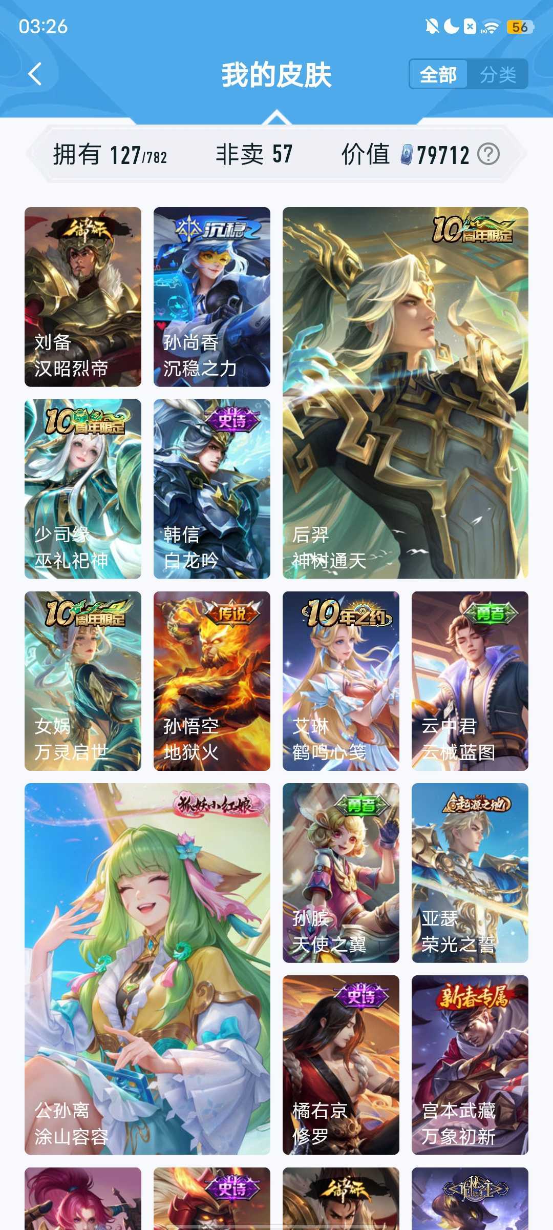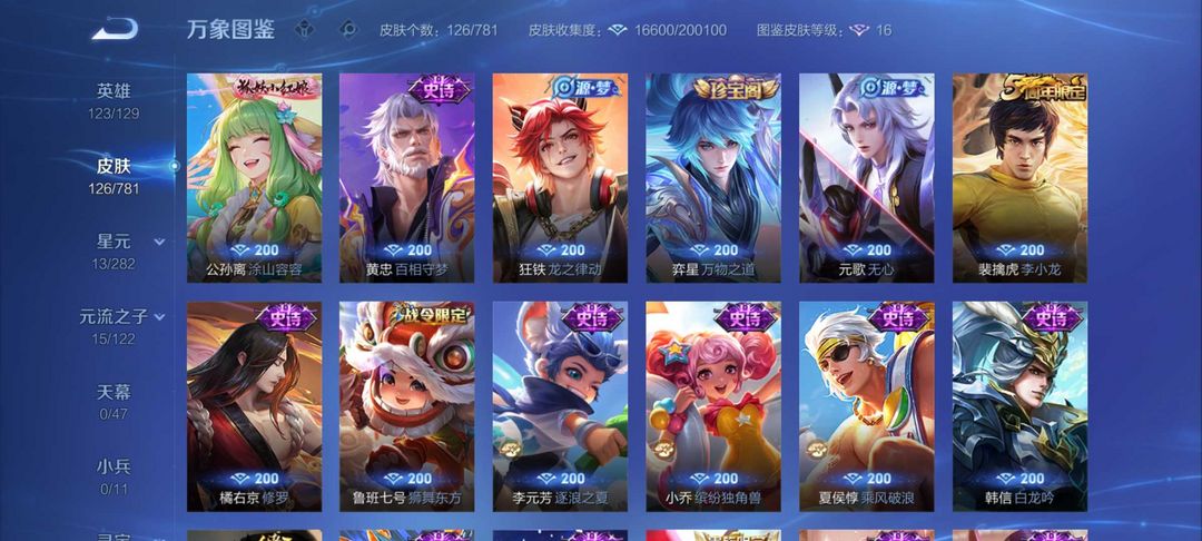 经典史诗皮:白龙吟,修罗,狮舞东方,百晓客,暗夜喵娘,万灵启世,巫礼祀神,李小龙,涂山容容,