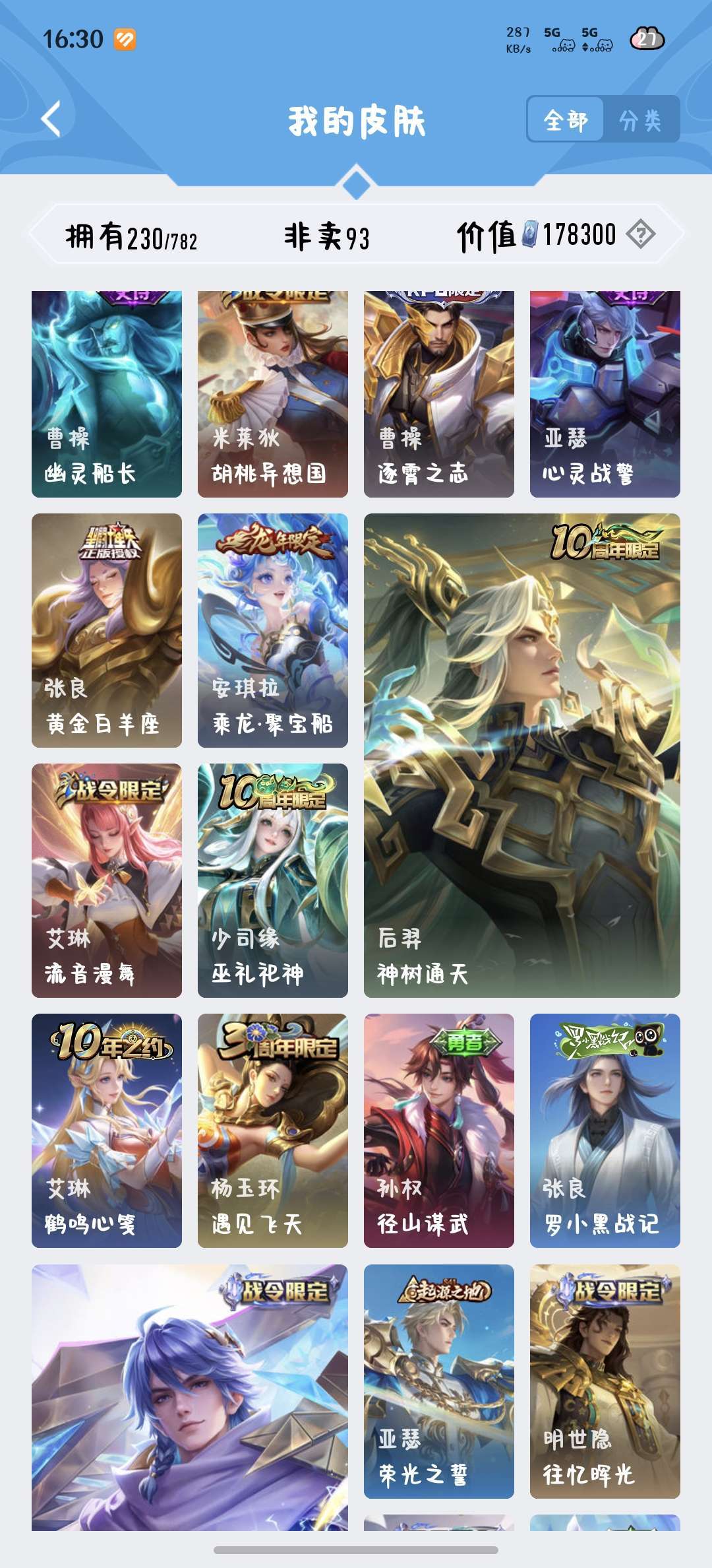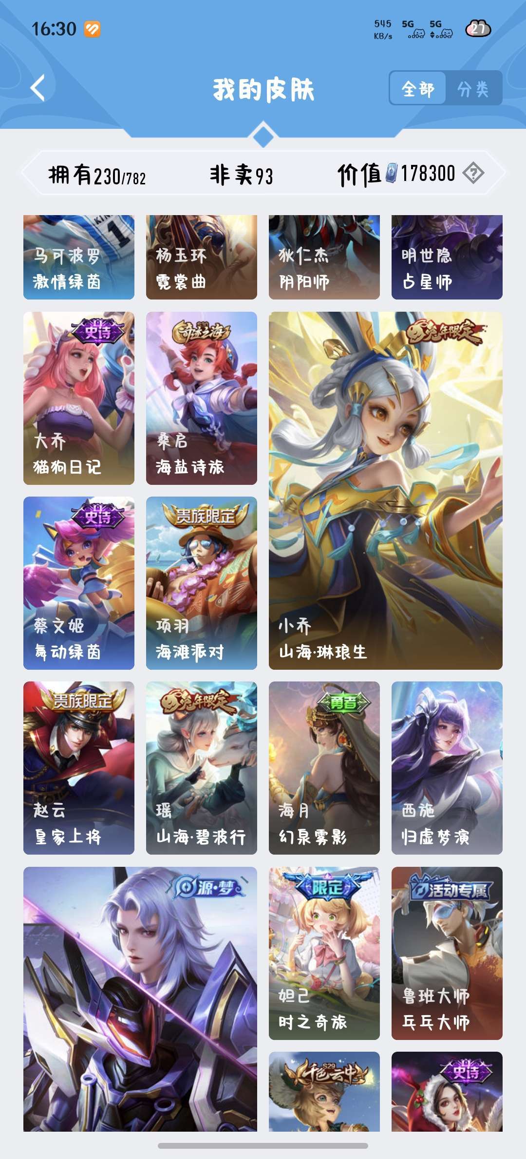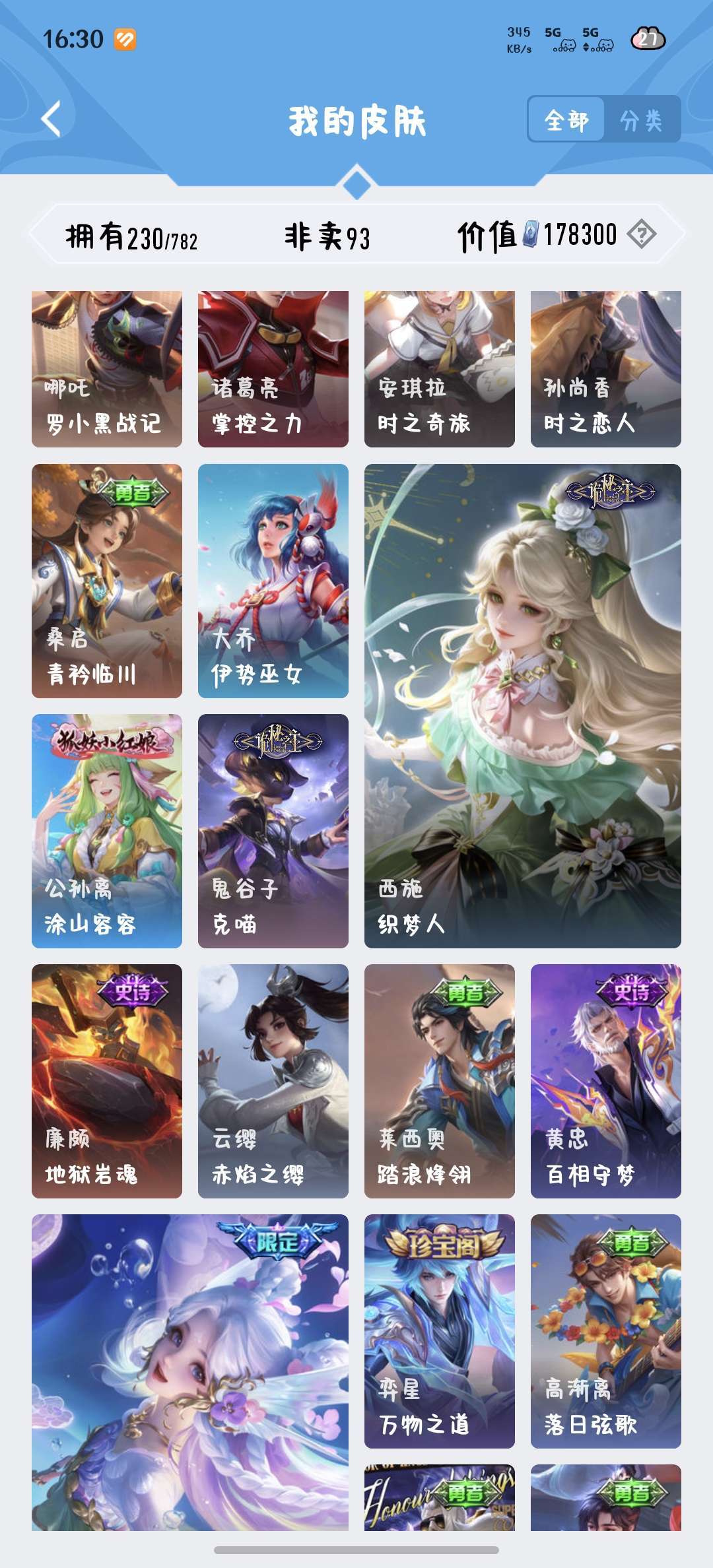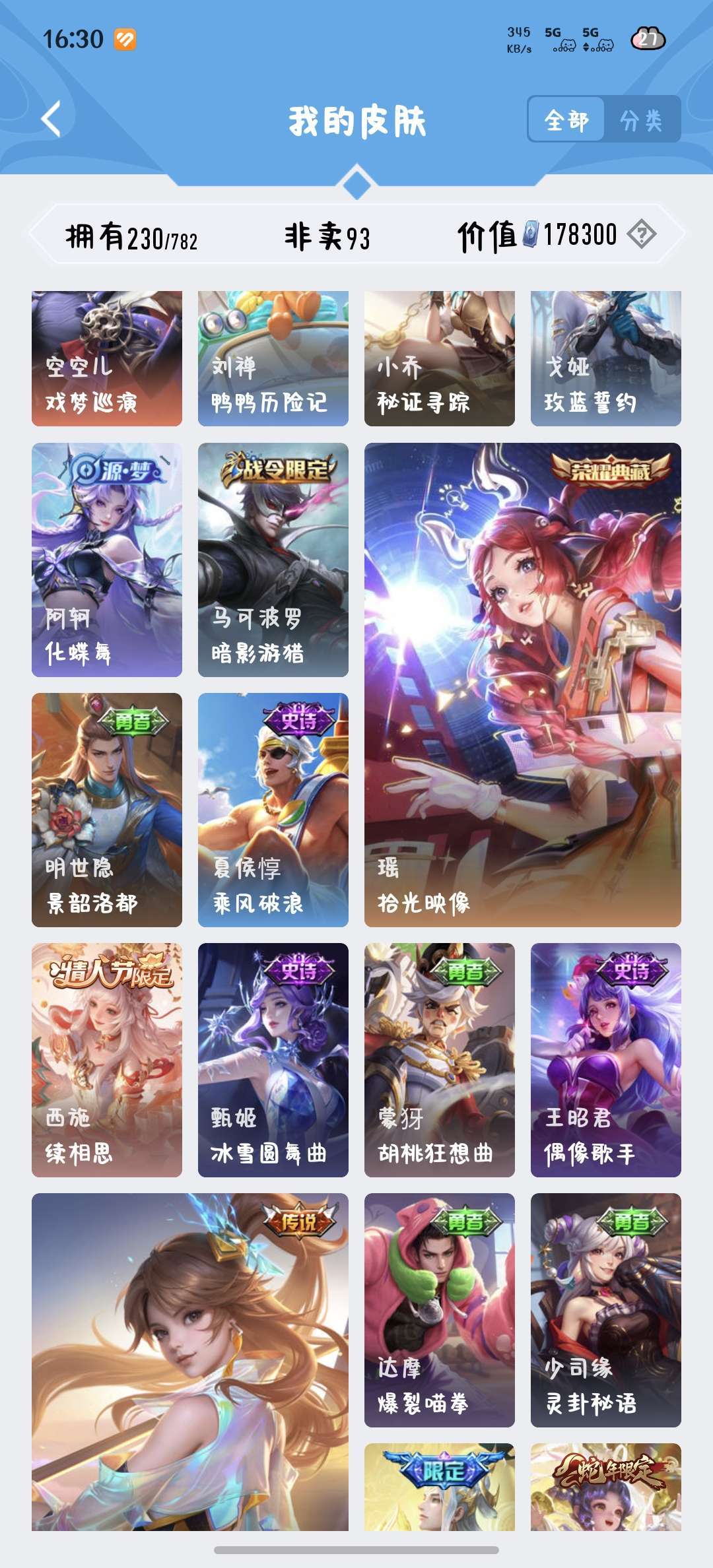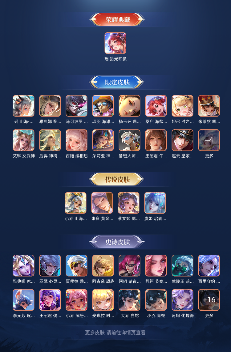 229皮肤瑶荣耀典藏和大耳狗,西施桑启全皮,除了武则天英雄都有