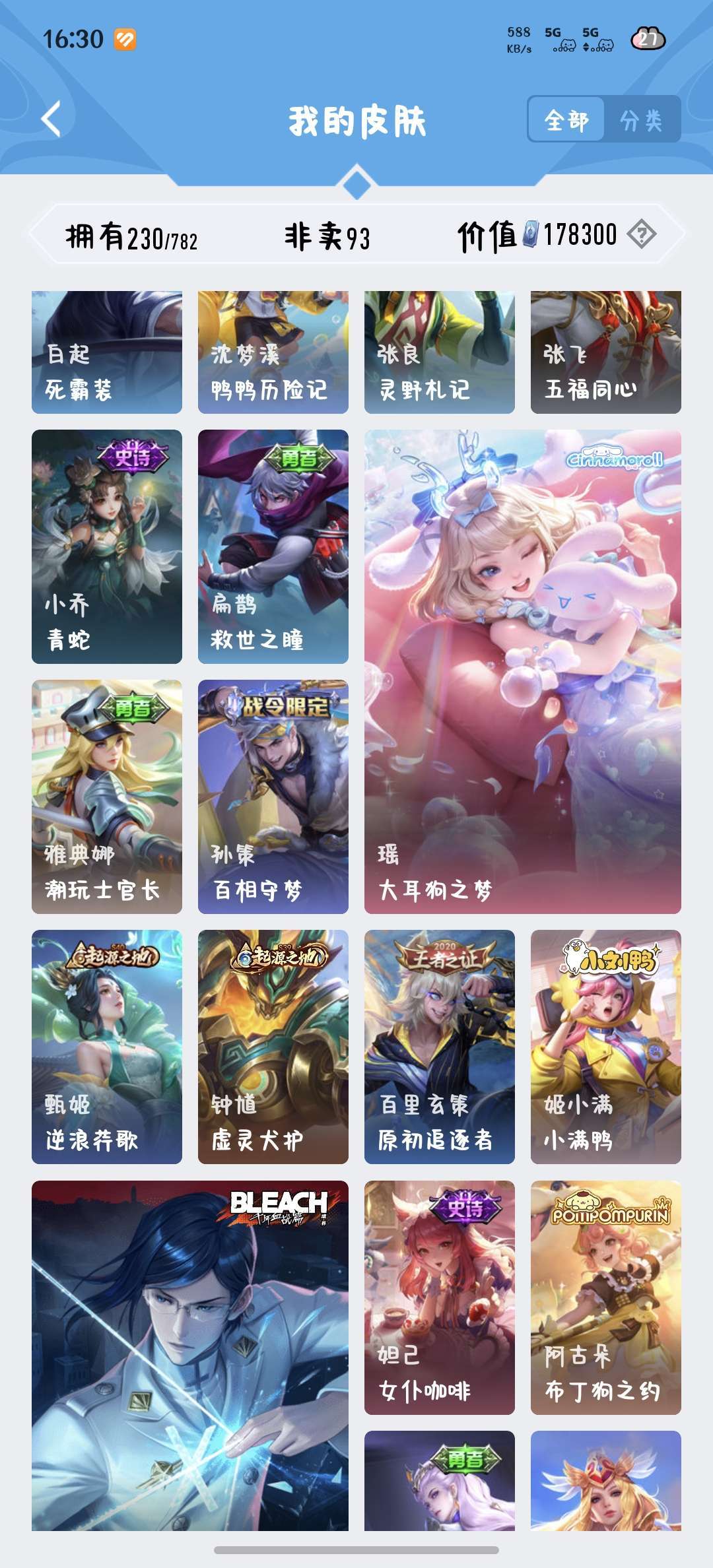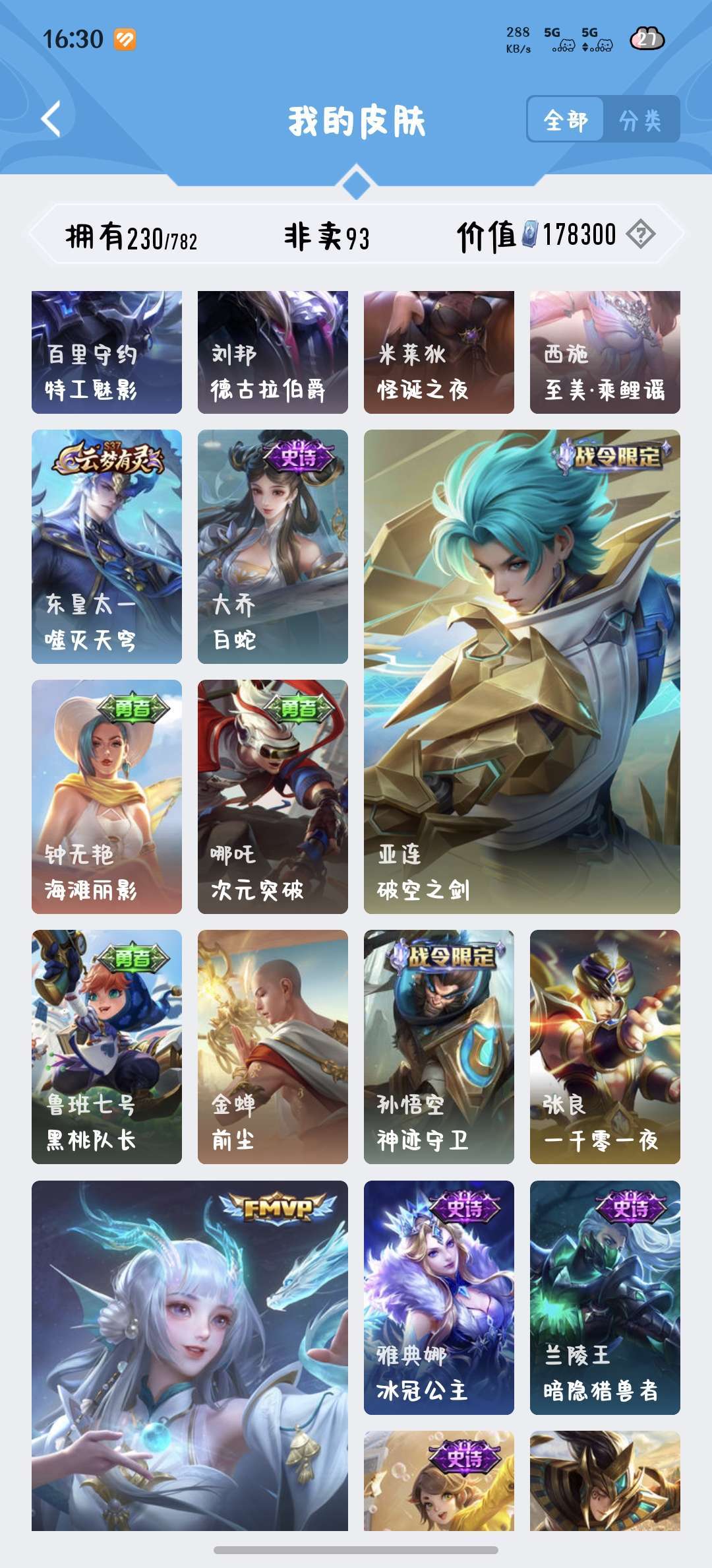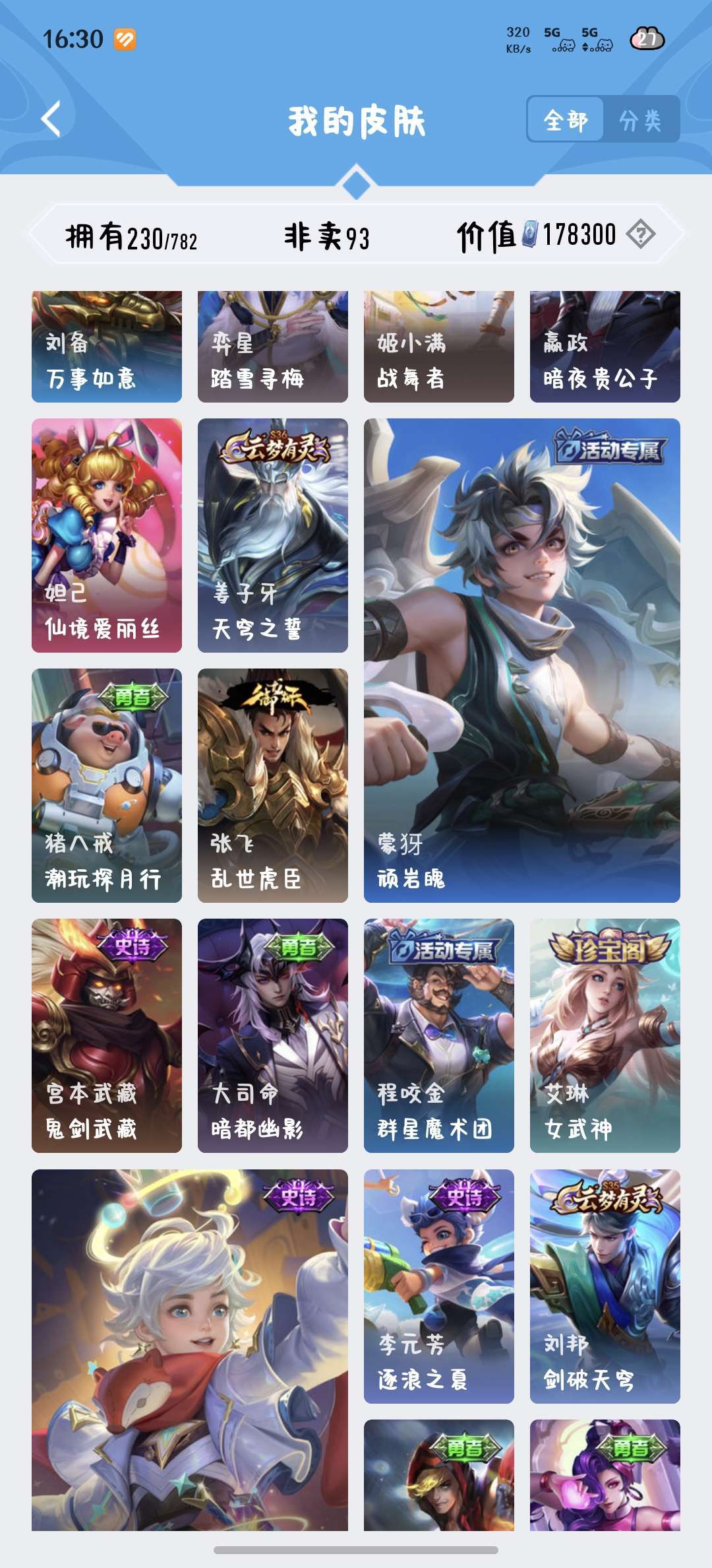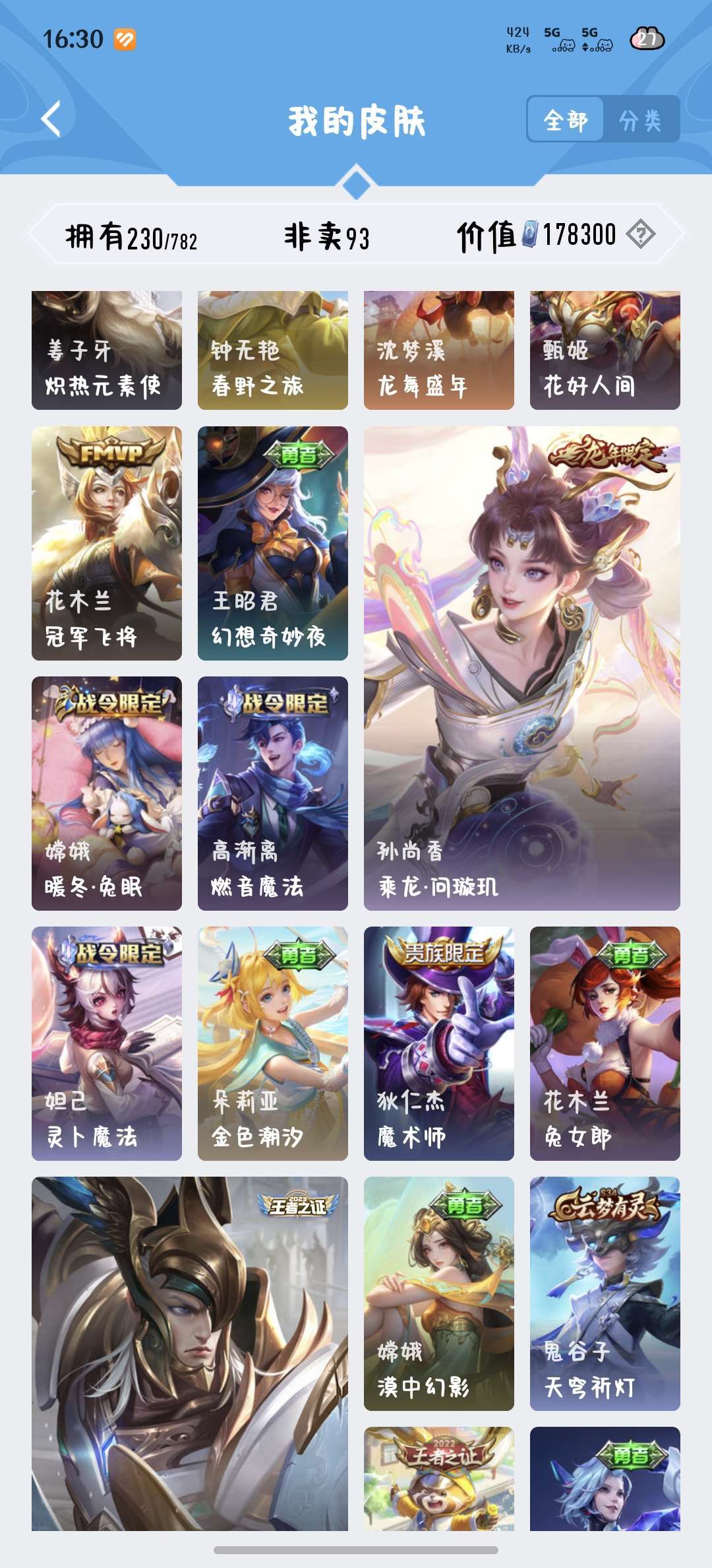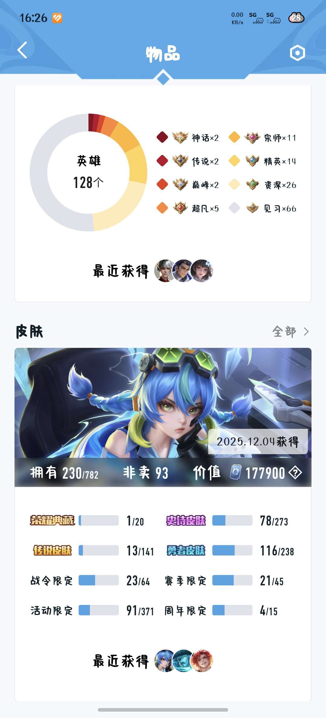 229皮肤瑶荣耀典藏和大耳狗,西施桑启全皮,除了武则天英雄都有