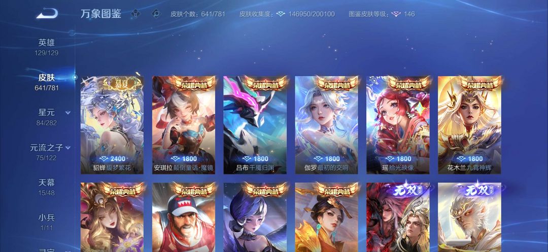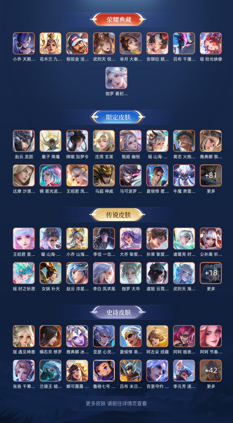 荣耀V10精品账号出租 640款皮肤全图鉴,9荣耀典藏齐全 臻品传说、限定皮肤拉满,英雄全齐 账号稳定无风险,排位娱乐都能玩