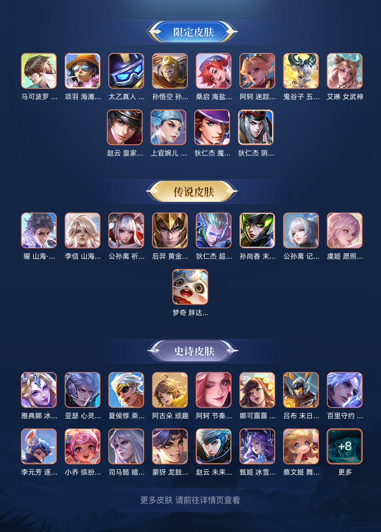 传说13个,5个年限,还有很多很多,这只是一部分一共204个皮肤,希望你可以租我的号,祝你玩的愉快!