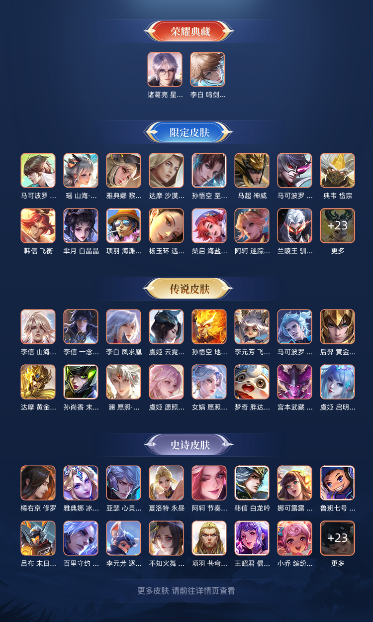 热门皮肤都有,限定也全,两个典藏,猴子限定都有,李白全皮