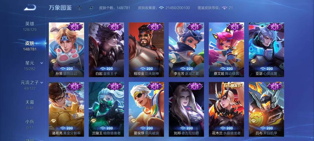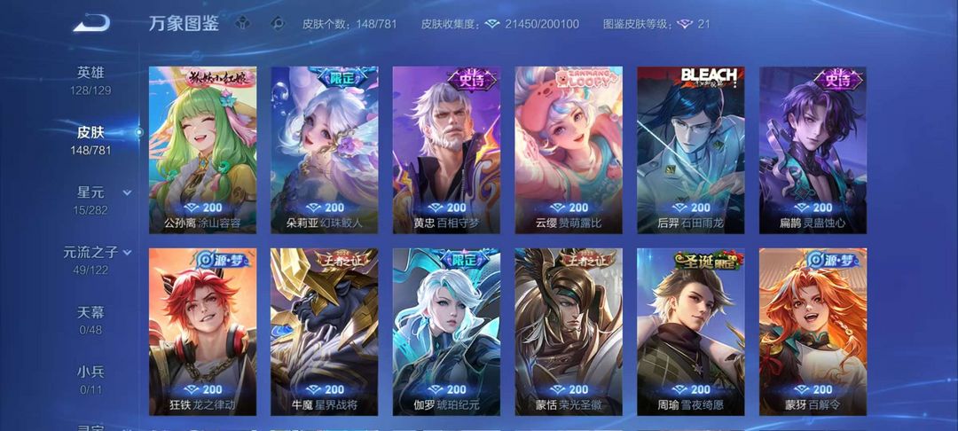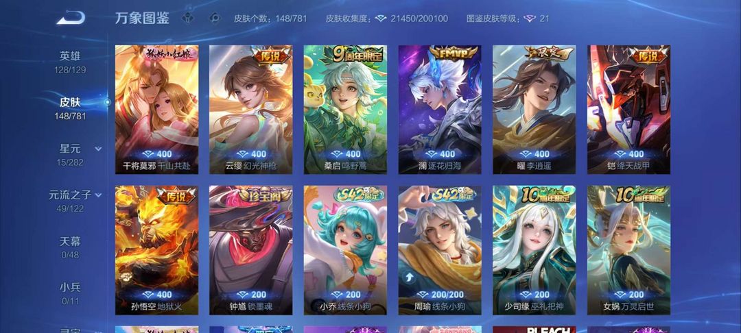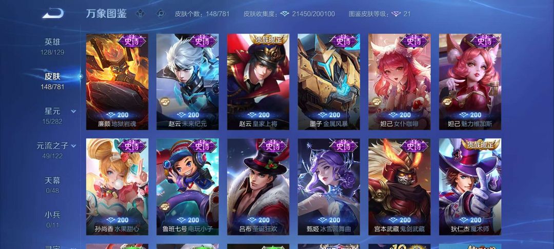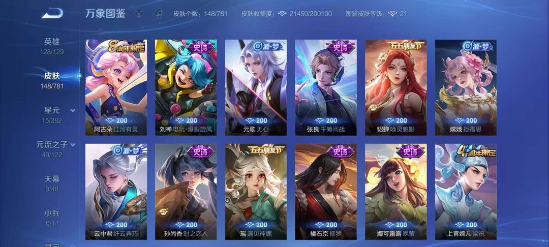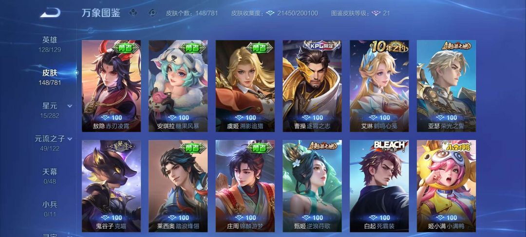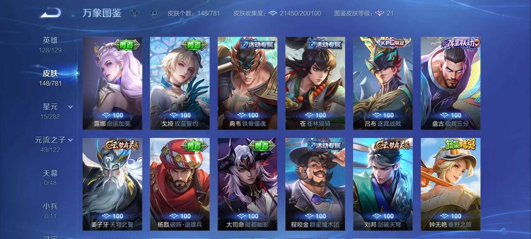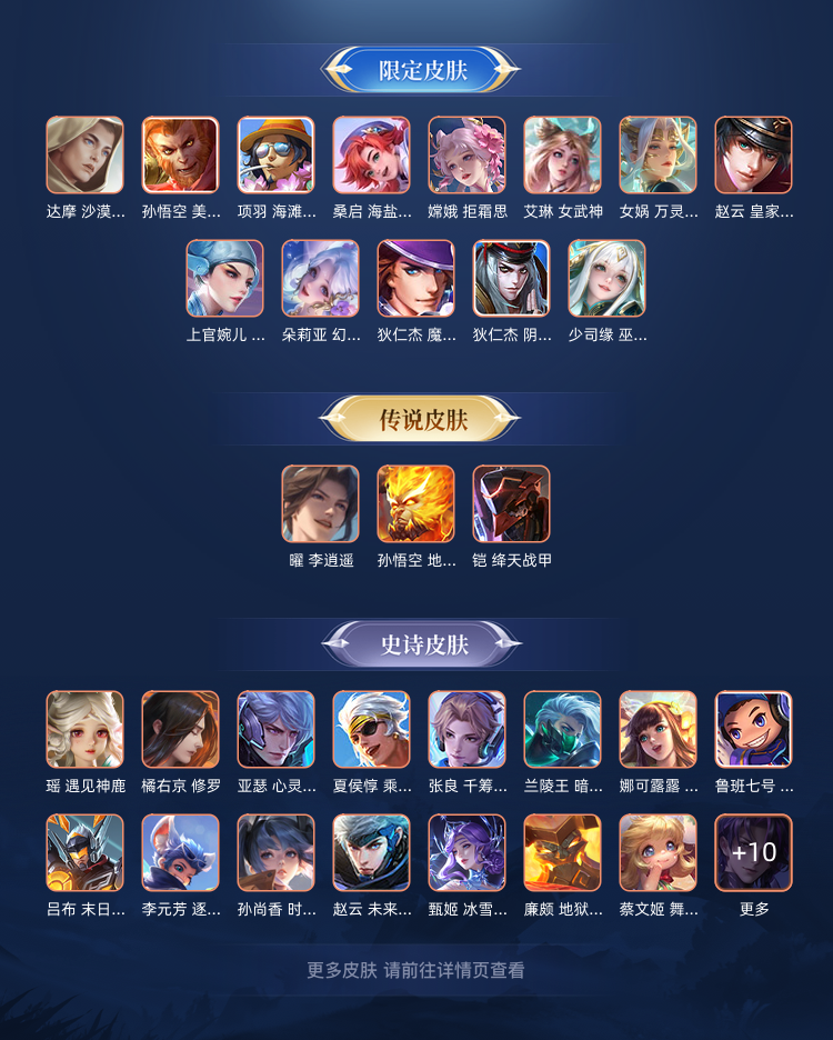 李逍遥、千山共赴、绛天战甲、幽冥火、锁墨魂、伽罗琥珀纪元、幻珠鲛人,赞萌露比,电玩小子,王者四星