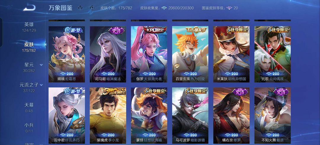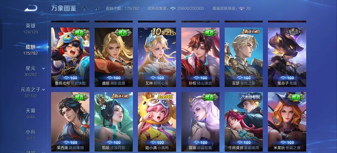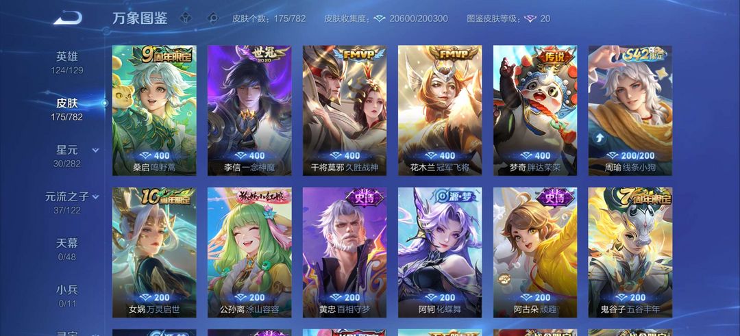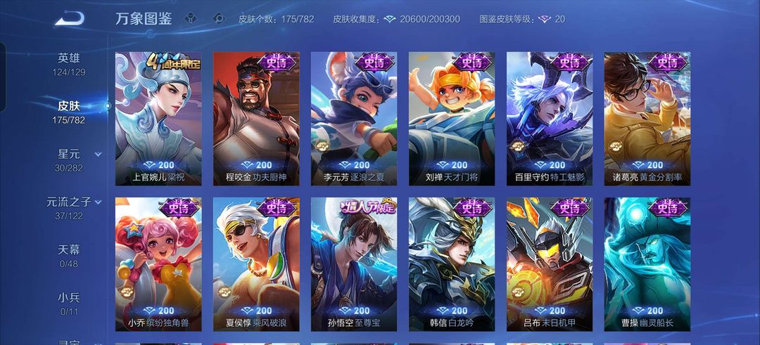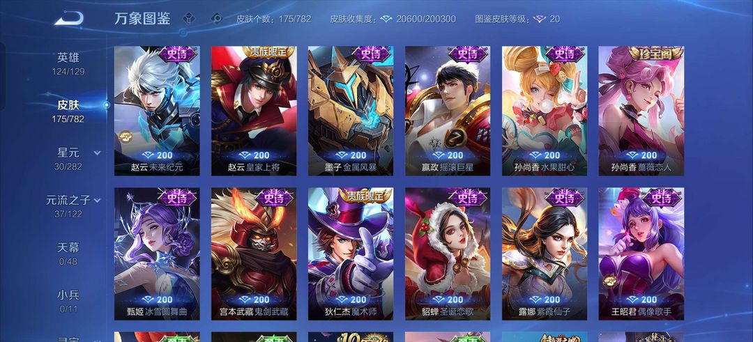 4个传说皮肤,多为史诗皮肤,可以排位至尊宝,一念神魔,久胜战神,冠军飞将,魅语,修罗