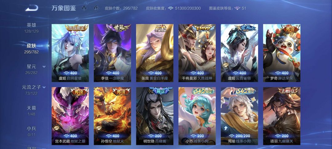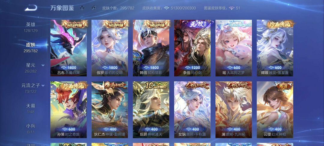 三个典藏伽罗最初的交响,吕布千魇归渊,韩信弑枪猎影,一个李信无双问心剑,三个珍品瑶大耳狗之梦,嫦娥,孙策,多个传说,铭文满级