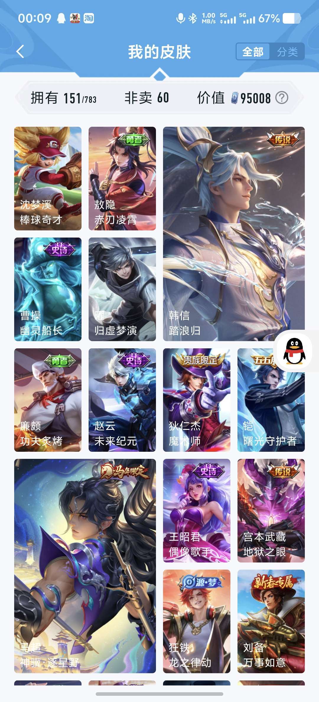 王者荣耀租号,英雄123,皮肤149,限定、史诗、活动限定都有,账号干净没违规,安全放心~