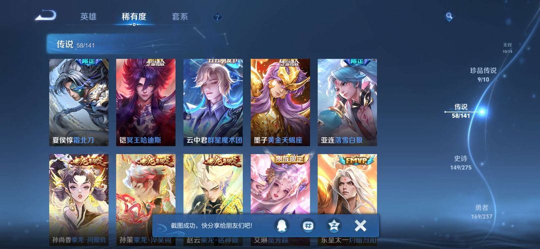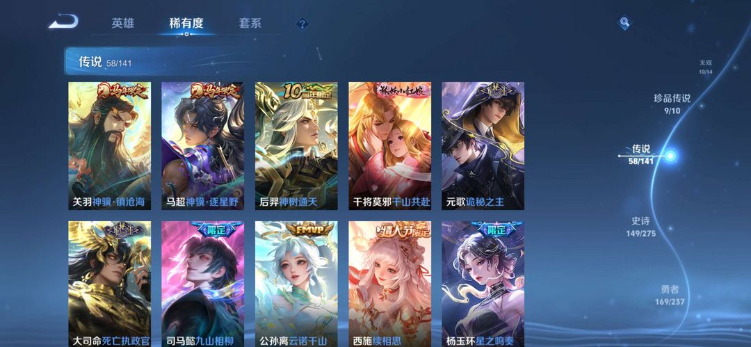 本游戏账号:V10用户,段位:王者 英雄多,皮肤多。典藏皮肤5个,感受典藏皮肤带来的优质体验快感,FMVP皮肤4个尽情享受FMVP皮肤带来的主角光环。