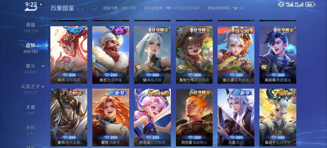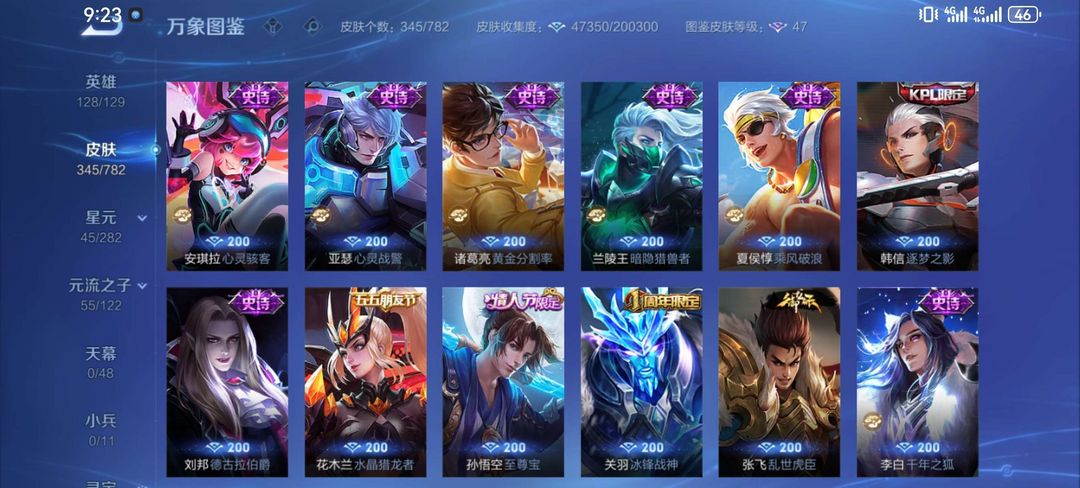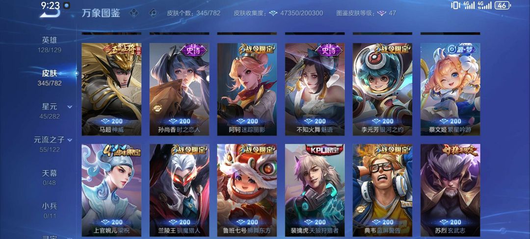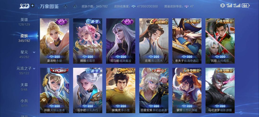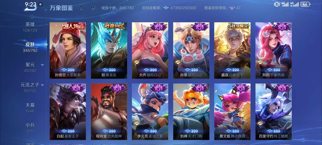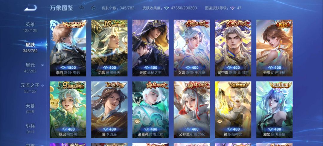 一典藏鸣剑曳影,凤求凰,至尊宝,白虎志,元歌诡秘之主,李逍遥,诸葛武陵仙君。皮肤很多,自己看