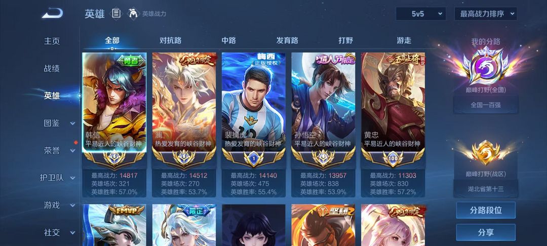(高危只能娱乐)巅峰百强60名框⭐2月正式服双国服韩信澜⭐在榜国11裴擒虎孙悟空⭐超多省级限定皮肤⭐