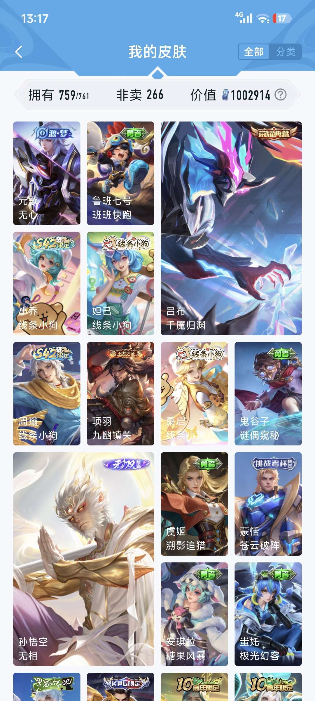 760皮准全满皮肤满荣耀典藏无双限定❤️吕布荣耀典藏千魇归渊❤️孙悟空无双限定无相