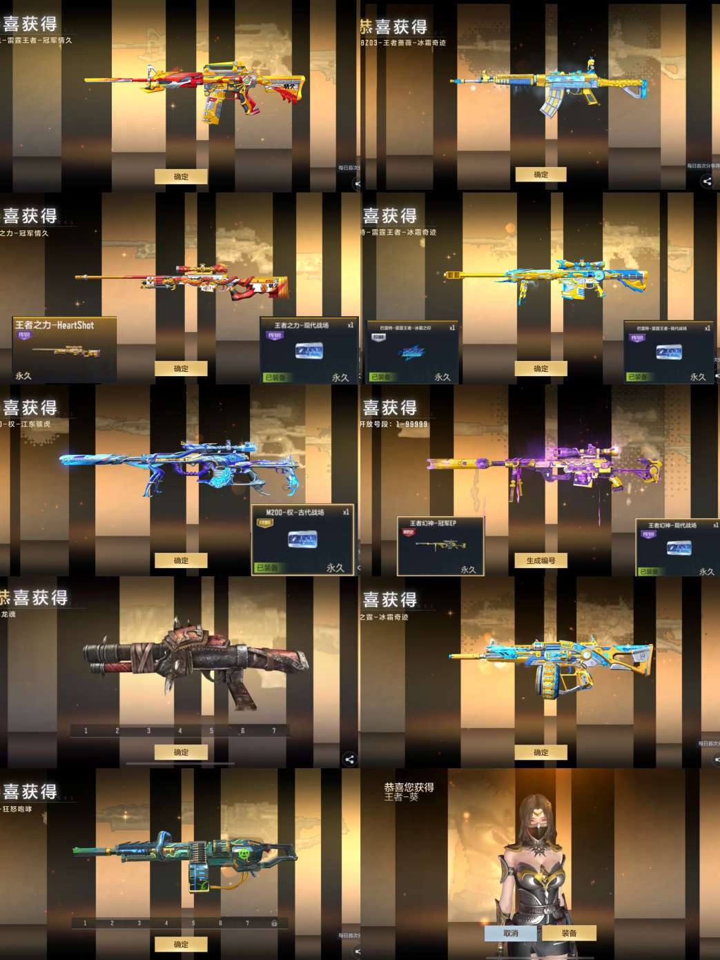主流王者武器有✨王者幻神,王者之竞,QBZ03-王者蔷薇,巴雷特雷霆王者,王者之力,王者之怒,王者之光,王者之神,王者之翎,王者之城,王者之翼,王者之势,王者之魄,王者之影*2,王者之心,王者之兽,王者之武,M12S-雷霆王者,王者之蝶,王者之霆,王者之狱,王者之烈*8,COP357-雷霆王者,王者之轮,王者之迹,王者之业,王者之电,王者之魂,王者之击,王者之破,雷霆王者之锋,王者之痕,王者之啸,王者之锋*2,M200-权,M200-幻神,AK47-奉先,M4A1-星象,AK47-元让,AK47-孟德,M4A1游骑兵,MK47-仁德,KSG孟获,AWM-妙才,AWM-游骑兵,黑龙魂,COP357-安琪拉*2,COP357-堕天神*2,COP357-星.象,COP357-雷神,COP357-旗袍,81式-机械纪元