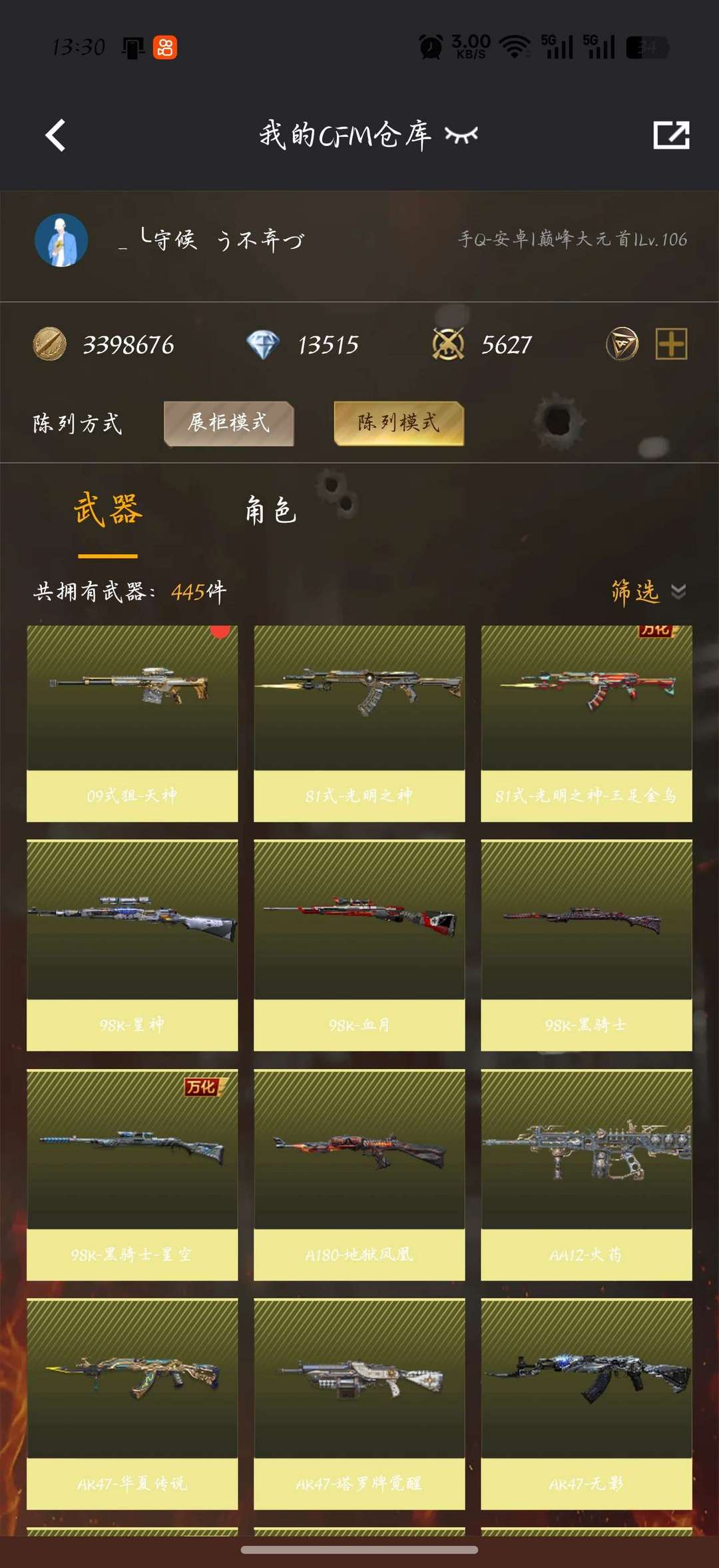安卓Q区CFM租号啦!巅峰大元首106级毕业号,445件武器涵盖81式光明神三足金乌、98K星神、火麒麟白虎等极品枪械,39个角色集齐关小雨、祝融夫人等稀有款,还有13515钻石可随意使用。短租长租都支持,小时租、天租任选,低价就能畅玩满配账号,排位碾压局必备,即租即玩不耽误!
