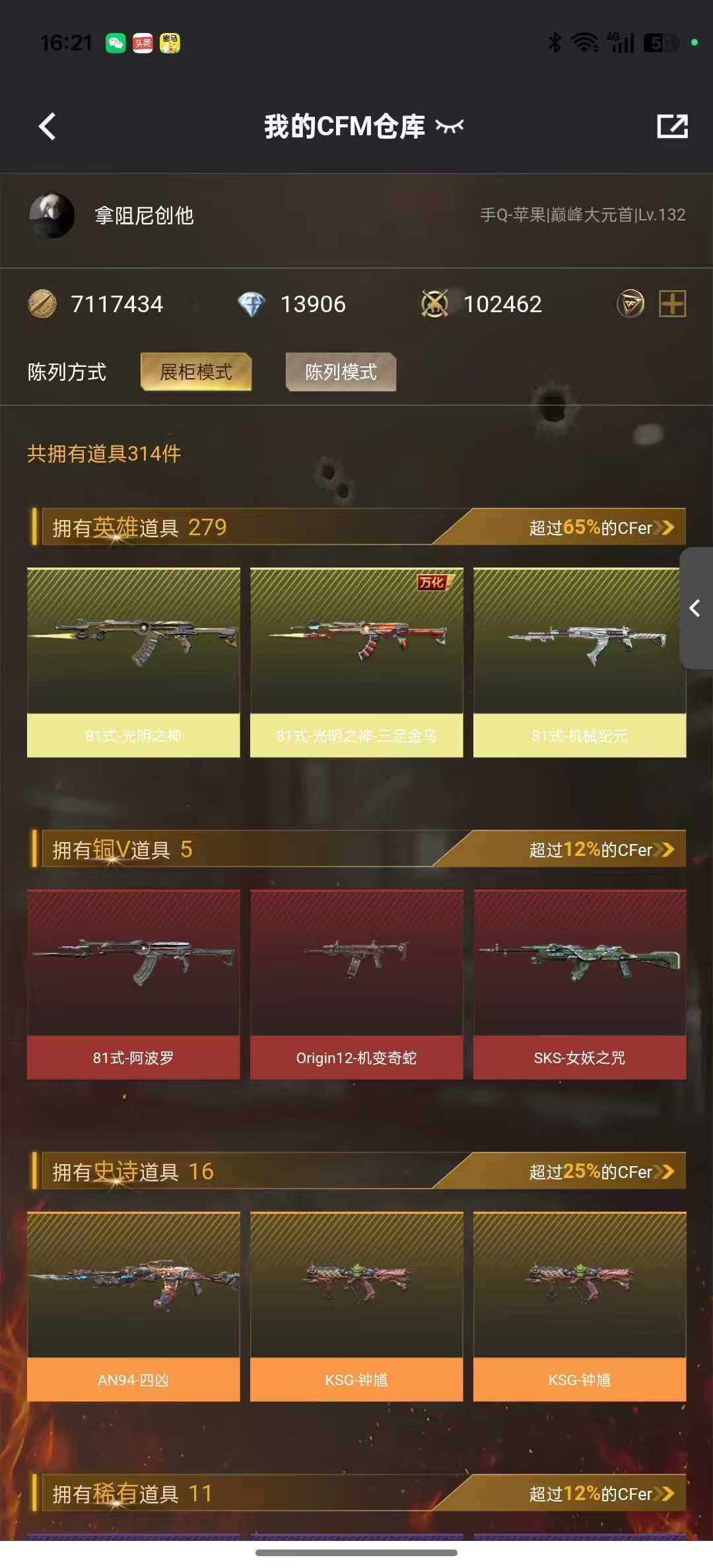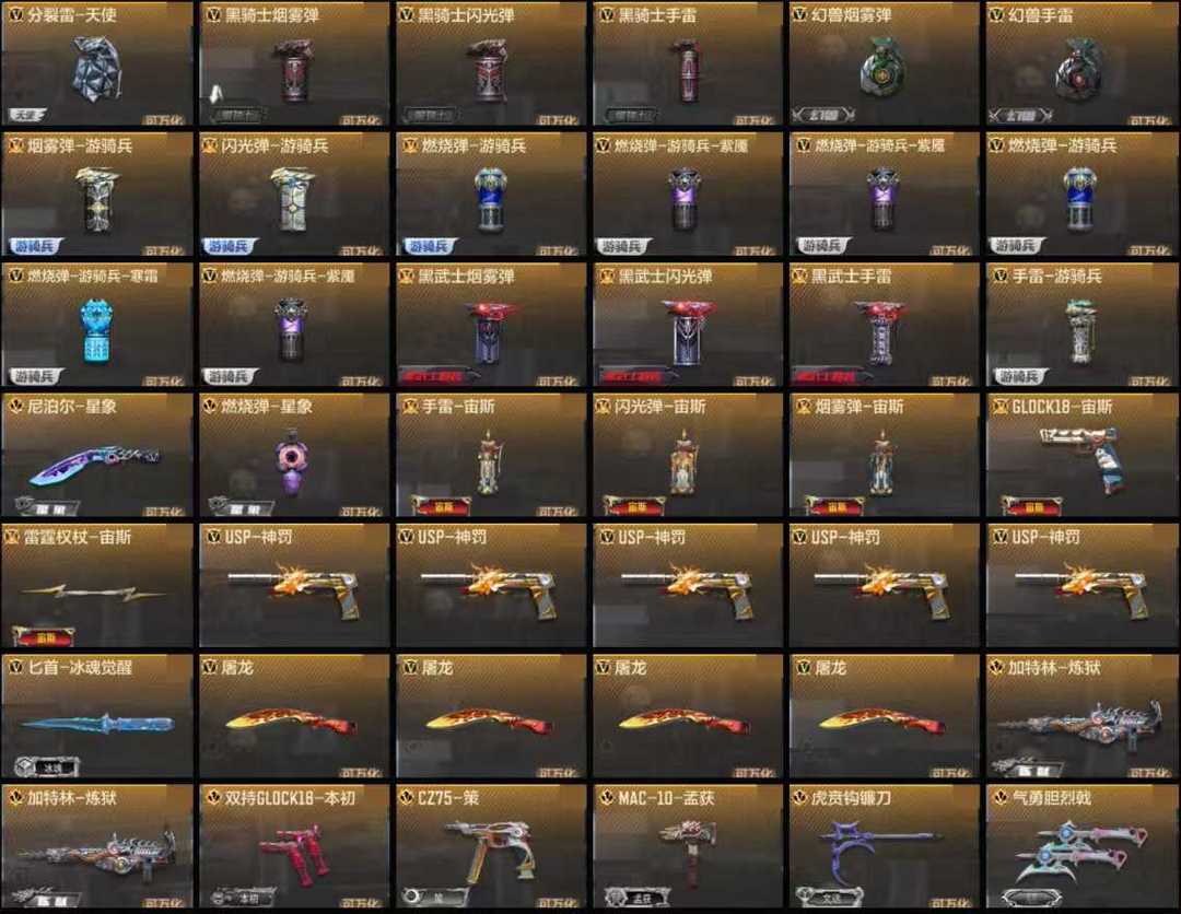 【武器】 武器-王者之蝶, 武器-王者之霆, 武器-M12S-雷霆王者, 武器-王者之魄, 武器-王者之影, 武器-王者之心, 武器-王者之力, 武器-王者之怒, 武器-王者之烈*3, 武器-王者之狱, 武器-王者之迹, 武器-王者之魂, 武器-AN94-盖, 武器-CZS2-仲康, 武器-KSG-孟获, 武器-AK47-奉先, 武器-AK47-孟德, 武器-AK47-波塞冬, 武器-M4A1-仲达, 武器-M4A1-星象, 武器-M4A1-游骑兵, 武器-AWM-妙才, 武器-M200-幻神, 武器-VEPR12-宙斯, 武器-黑龙魂, 武器-巴雷特-雷神, 武器-M12S-天公, 武器-双持CZS2-魔礼寿, 武器-81式-光明之神, 武器-81式-机械纪元, 武器-MK47-云舞, 武器-COP357-安琪拉, 武器-COP357-堕天神*2, 武器-COP357-雷霆, 武器-柯尔特-仲达, 武器-MK23-双脊龙, 武器-双管猎枪-文远, 武器-炽芒蝶刃, 武器-98K-星神, 武器-98K-黑骑士, 武器-A
