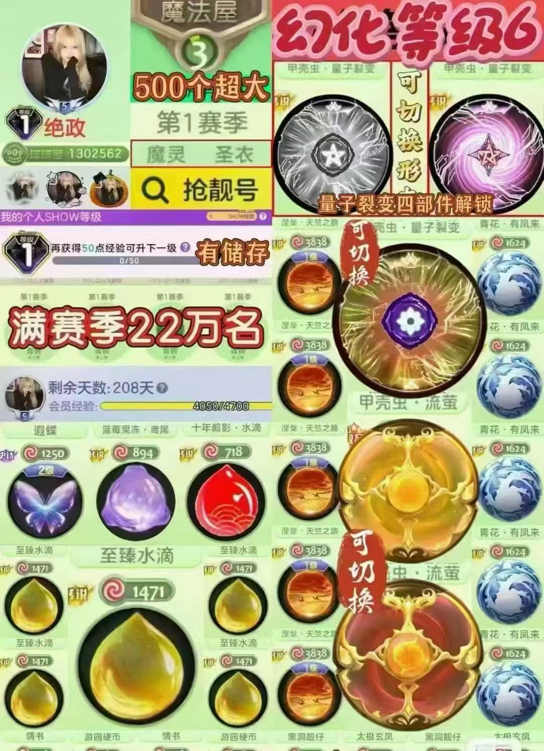 顶配1秀漩涡号*满赛季2.2万排名年卡*幻化粉丝量子全解锁漩涡甲壳虫*双系统漩涡形态黑白*流萤十字架