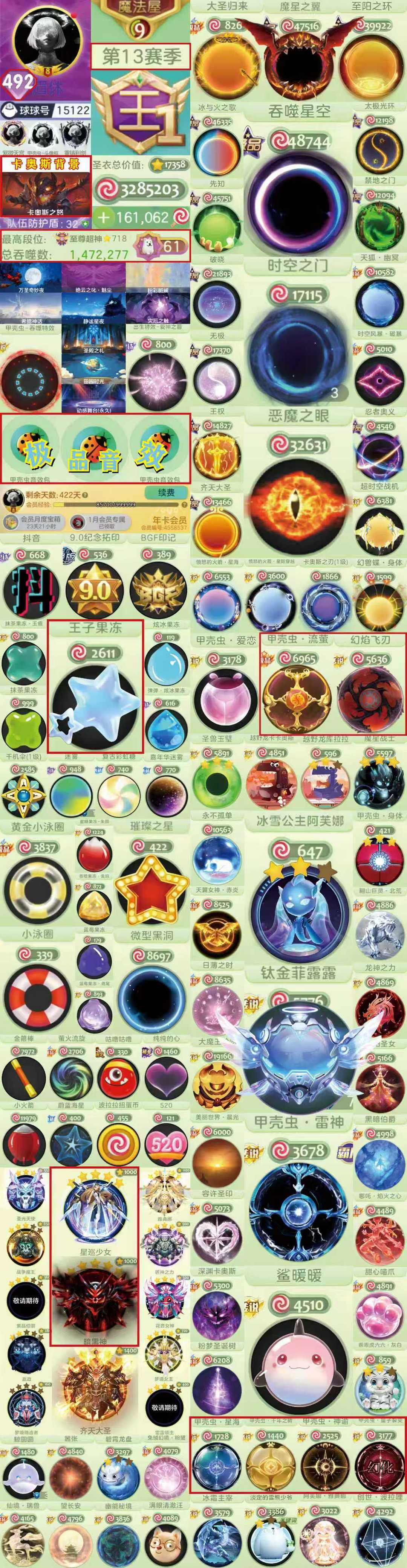 静谧空间*王492秀高赛年卡*2级阿芙娜*王子果冻璀璨*黑洞恶魔*雷神甲壳虫神谕*幻化十字架*鲨暖暖