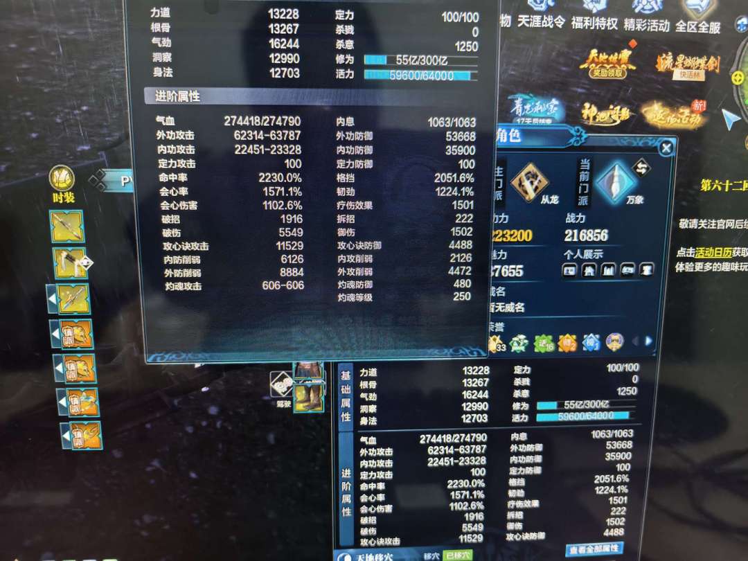 1104会伤,二星毛,二重飞仙,24.7功力,21.72战力。纯副本属性加点万象漂亮女号有冰翅膀。