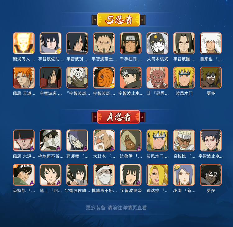 198忍者暴土,泳装鼬,新春止水,新春鼬,新春小南,漂泊武士再不斩等 S秽土斑,秽土水门,秽土鼬,天道超,大筒木桃式等 A骨架,漂泊带土,侠隐佐助等 其余看图或上号自己研究吧!