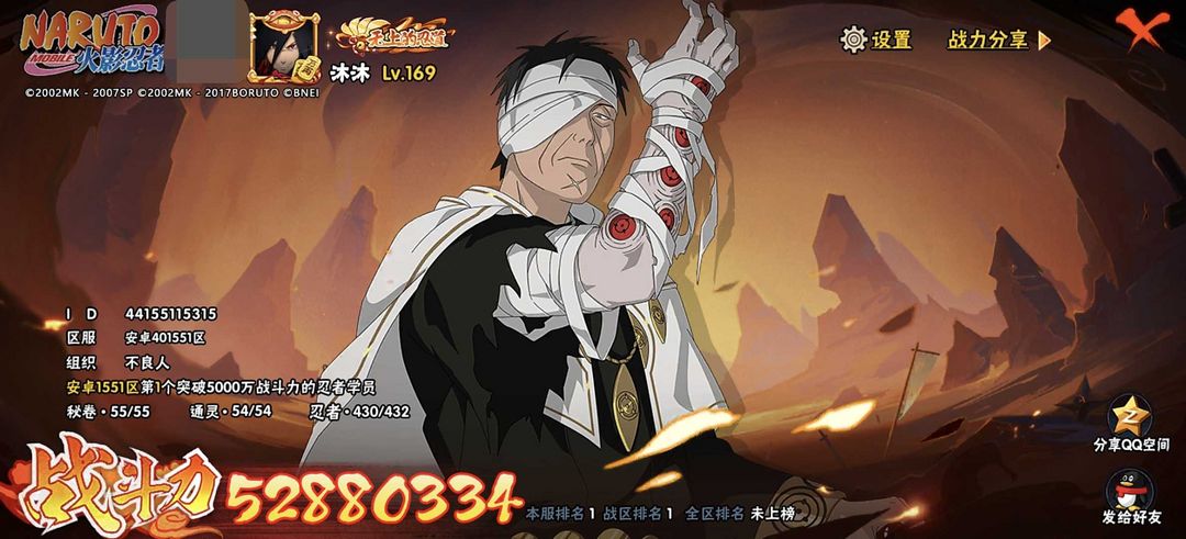 漂泊团藏✨5300万无上忍道✨3500属攻秒团本✨全忍者全通灵✨82级魅力✨神驹斑✨黑绝✨漂泊带土