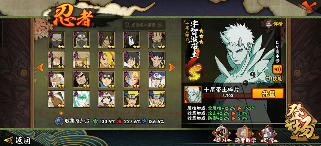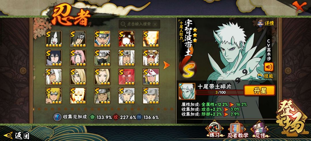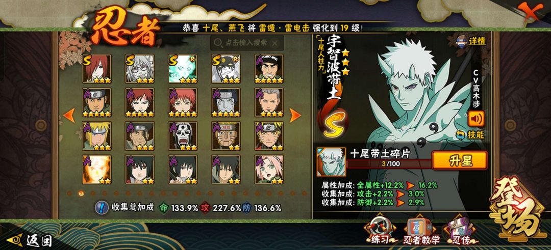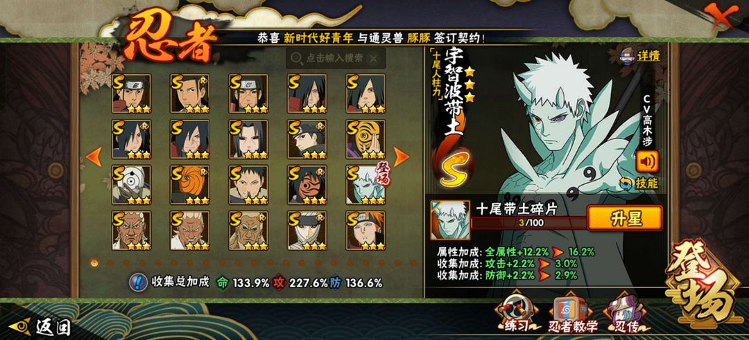 六道带土已秒,九喇嘛水门已秒,神农,六尾鸣人已秒,传说三忍自来也已秒,漂泊带土已秒,须佐卡卡西已秒,须佐止水,忍战小李,忍战雷,大筒木桃式,桃式博人,最终章雏田已秒,解斑已秒,漂泊小南已秒,万花筒佐助已秒,红夜带土已秒,不缘已出,快来体验吧,可以打段位,t0级别高招,忍战樱已秒⚡青年长门,九喇嘛鸣人⚡无,死门凯,木叶创立斑,虎皮面具,忍战带土,秽土长门,秽土柱间,秽土三代,青年水门,须佐佐助,秽土斑等强度忍者。