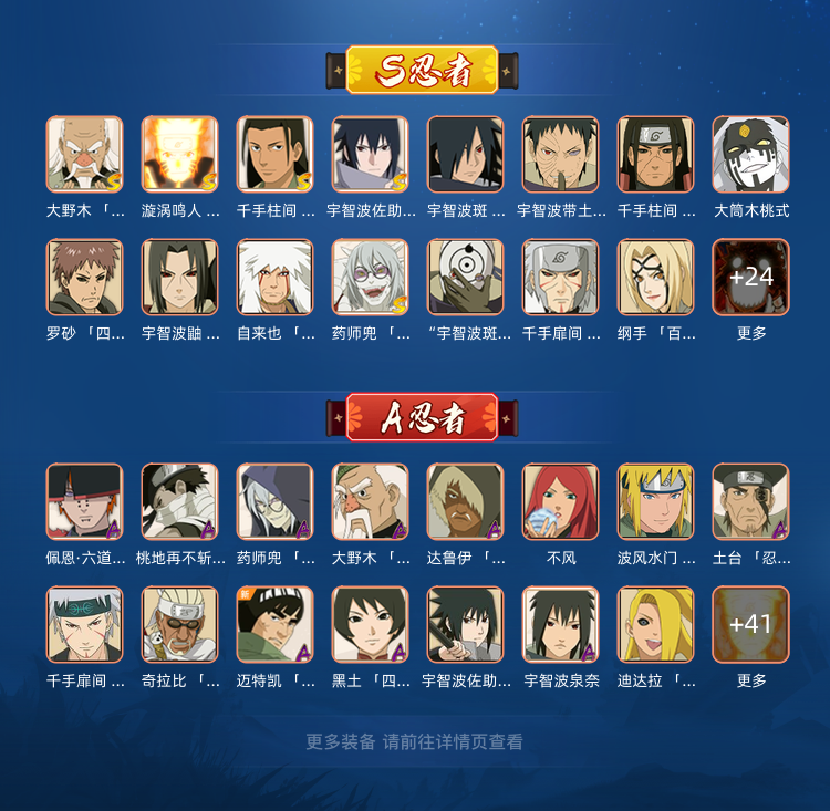 有创立斑,大筒木金式,罗沙,六尾鸣人,红夜带土,创立柱间,须佐止水等强力s忍,还有漂泊佩恩,漂泊二代,漂泊带土等点卷a忍,以及最强通灵兽熊猫,让你体验忍者的快乐