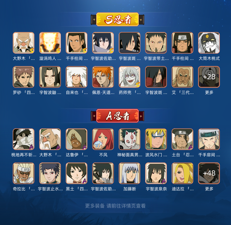 348个忍者,漂泊扉间,暴怒带土,新春水门,秽土柱间,秽土斑,白面具,长门,秽土二代,秽土三代,死门凯,天道超,大野木忍界大战,创立班,罗砂,三代目雷影,大筒木,面麻,破面带土,全a高招