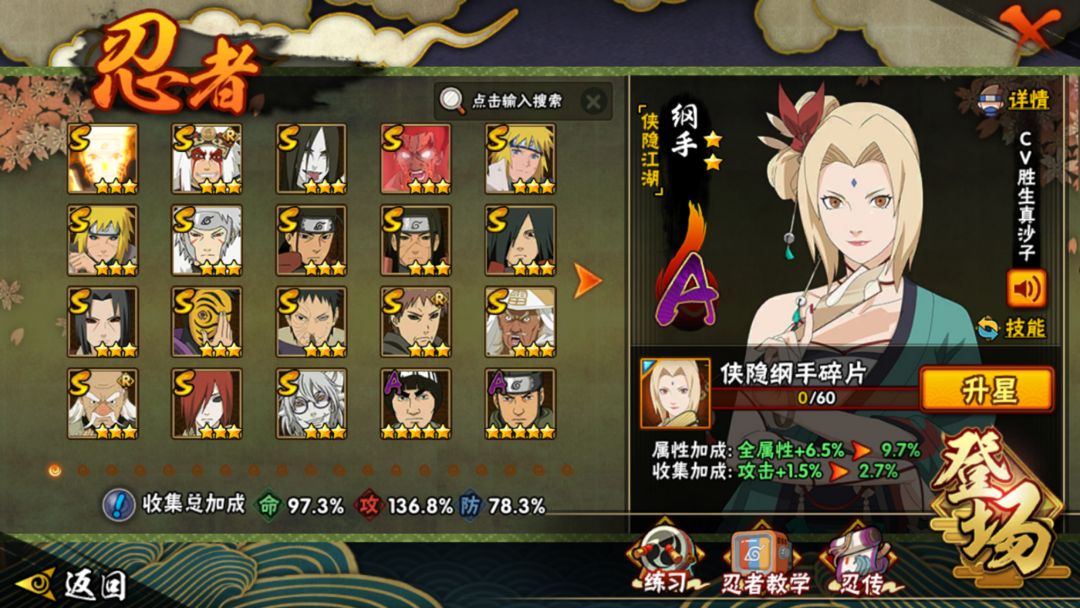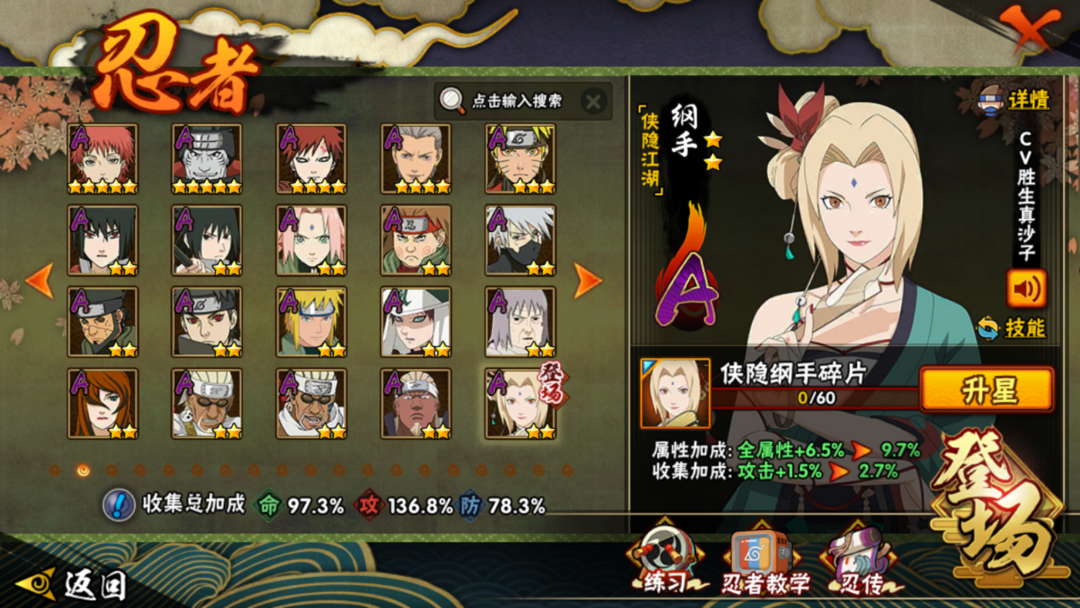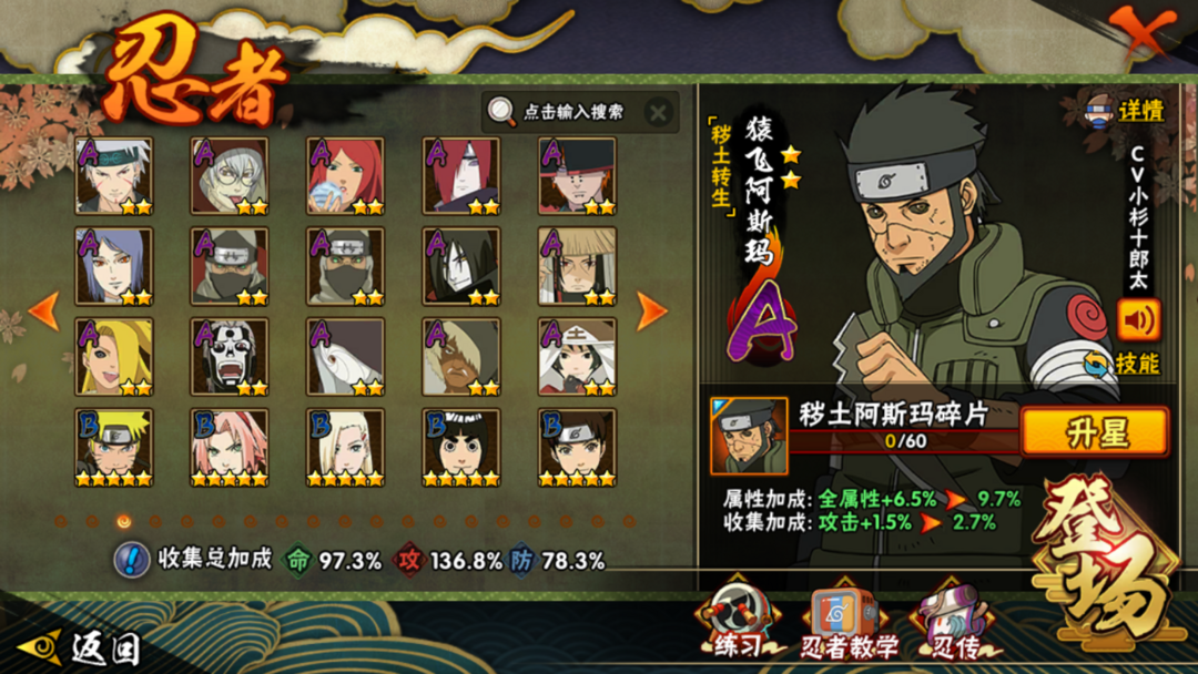 长门 「秽土转生」;宇智波带土 「忍界大战」;艾 「四代目雷影」;自来也 「舞之豪杰」;波风水门;罗砂 「四代目风影」;大蛇丸;波风水门 「秽土转生」;大野木 「忍界大战」;宇智波鼬 「秽土转生」;神秘面具男;千手柱间;千手扉间;宇智波斑;漩涡鸣人 「九喇嘛连结」;迈特凯 「死门」;药师兜 「仙人模式