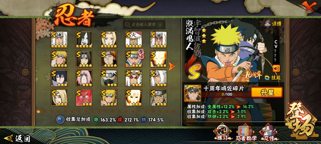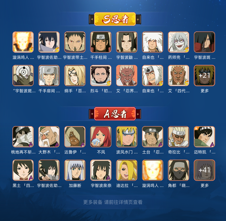 S忍者:大野木 「忍界大战」;漩涡鸣人 「九喇嘛连结」;宇智波佐助 「永恒万花筒」;宇智波带土 「忍界大战」;千手柱间 「秽土转生」;宇智波鼬 「秽土转生」;自来也 「舞之豪杰」;药师兜 「仙人模式」;宇智波斑 「秽土转生」;艾 「三代目雷影」;“宇智波斑” 「白面具」;千手扉间 「秽土转生」;纲手 「百豪」;无 「二代目土影」;烈斗 「初代目风影」;艾 「忍界大战」;自来也 「传说中的三忍」;漩涡鸣人 宇智波佐助;艾 「四代目雷影」;波风水门;波风水门 「秽土转生」;大蛇丸;大野木 「三代目土影」;纲手;佩恩 「天道」;