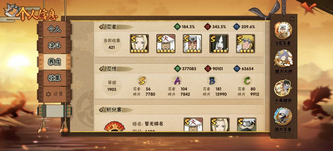 漂泊团藏已出!神驹斑已出!三千万战力! 禁止利用账号进行开挂、使用辅助违规软件诈骗等违规操作。 神驹新春系列忍者已出! 421个忍者,S忍只差金银角,A忍只差几个328忍者! B忍差四尾鸣人,C忍齐全! 忍具150自来也一整套毕业,总属攻2000+! 3170w战力,通灵密卷基本齐全! 决斗场与带团本均可!