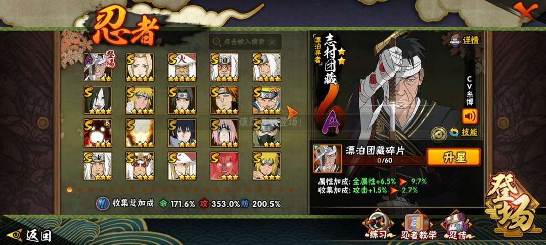 三百多个忍者,拥有全高招S忍和A忍,全忍法帖S忍者,和大部分热门点卷A忍,多个648A忍,可玩性高,高战可打团本,可打排位,拥有大部分热门点卷通灵