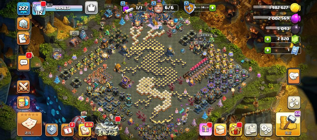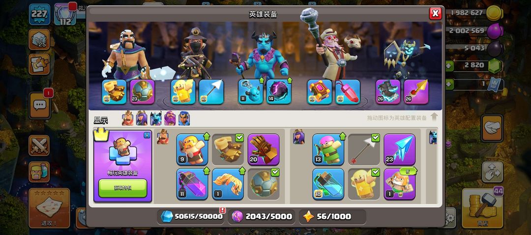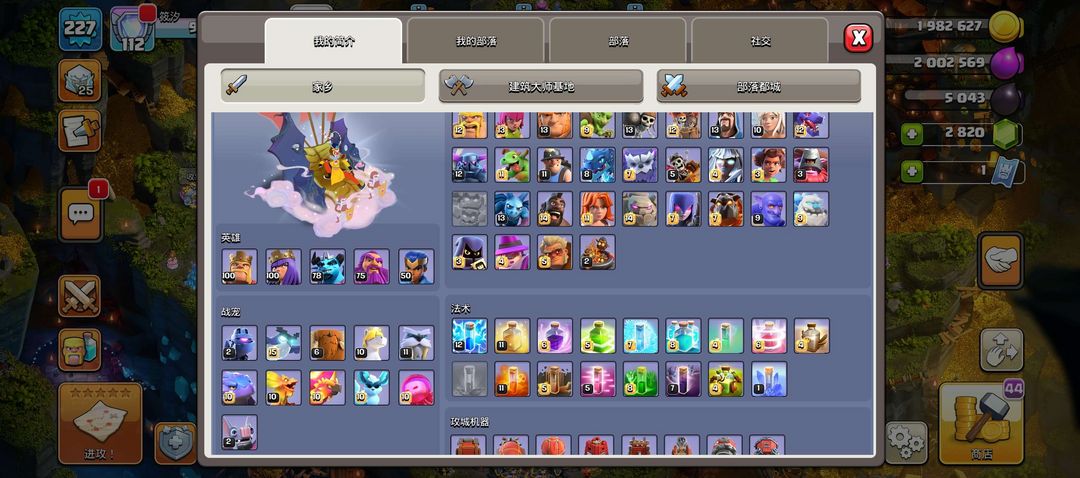 112繁荣度,17本满防,满四王(技能高配置),高兵种,可以捐兵,部落战