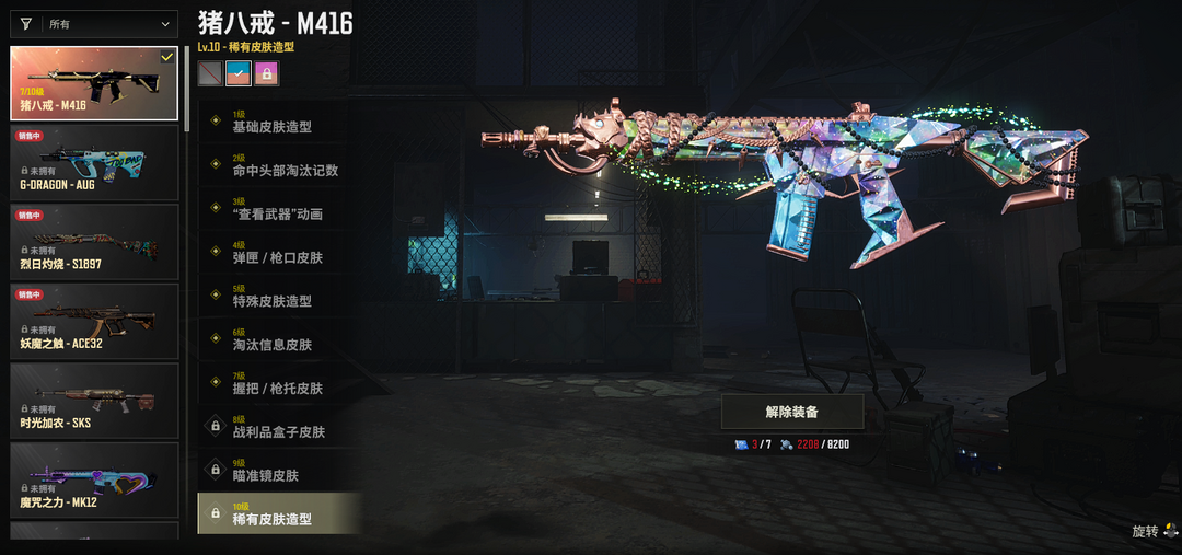 ⑩级猪八戒M4✅异色猪八戒M4✅金色成就M762✅彩虹之上SLR✅漫彩四溢SKS✅湮灭M24✅水手S