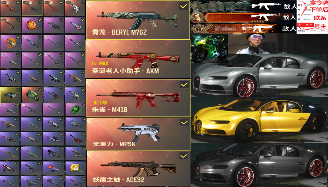 布加迪威龙跑车✅⑩青龙M762⑩圣诞AK⑧M4朱雀重力MP5妖魔ACE战神黑人柏林东南亚杜卡迪可排位