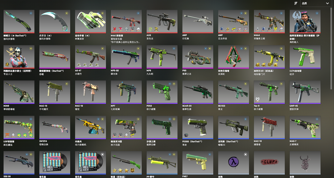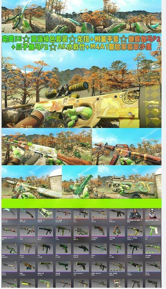 完美5E⭐高端绿色套装⭐龙狙+树篱手套⭐蝴蝶伽马P2+爪子伽马P2⭐AK水栽竹+M4A1冒险家+翡翠