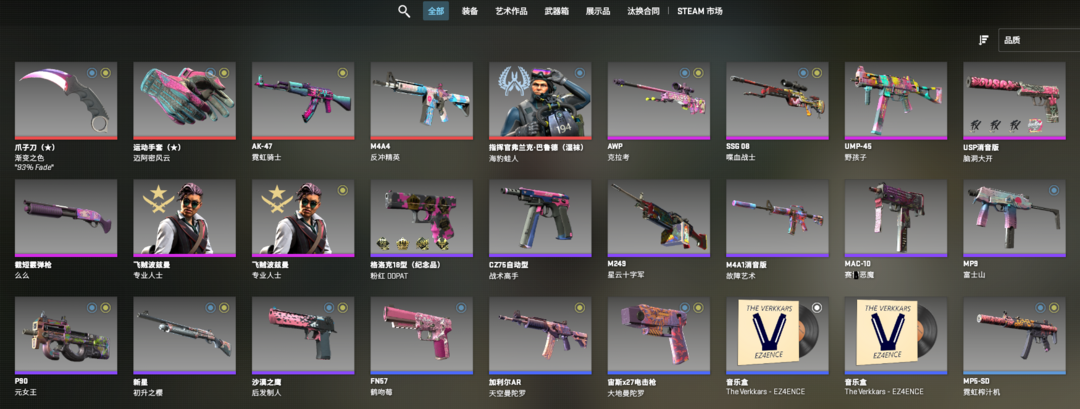 完美A段丨粉色套丨爪子刀渐变之色丨迈阿密手套丨霓虹骑士AK丨克拉考AWP丨故障艺术M4A1
