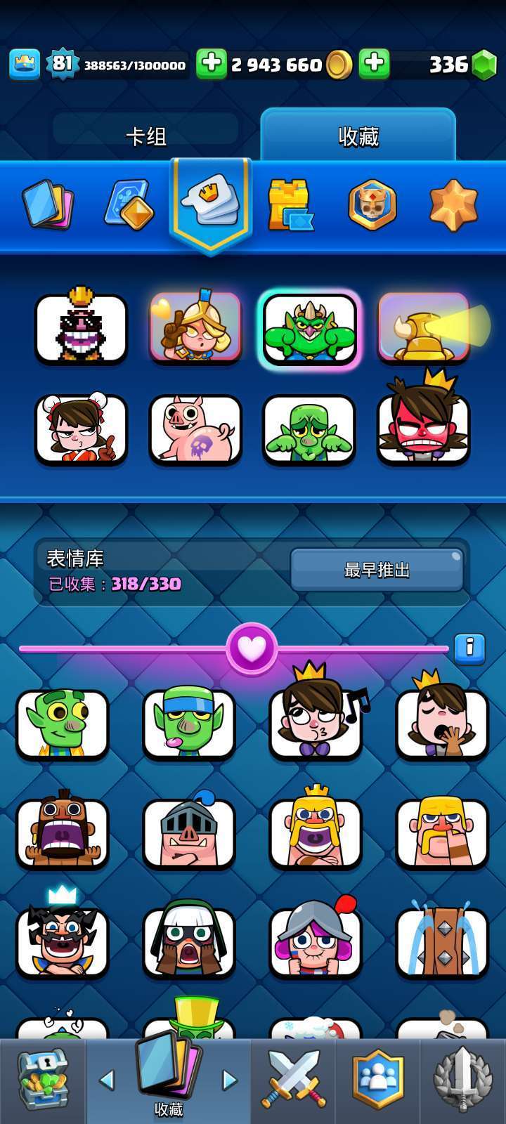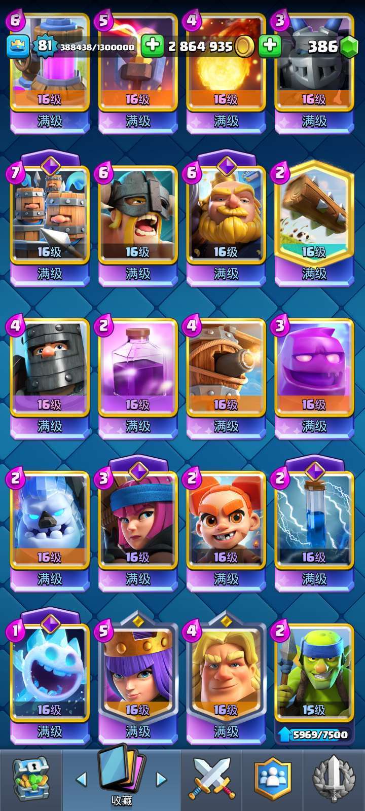 81级国王,精英皮卡,巨人,38张觉醒,全卡15级,24张16级,318个表情,多塔皮,投诉拉黑