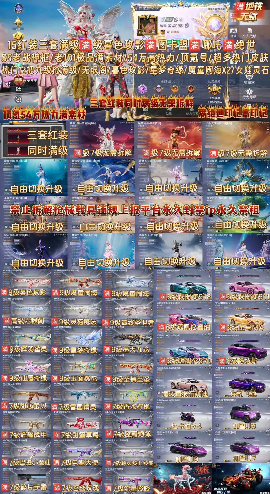 顶氪号【15红三套满级同时登场】S5老框暮色玫影老101哪吒图卡盟12把九级枪满级星梦无垠阁保时捷