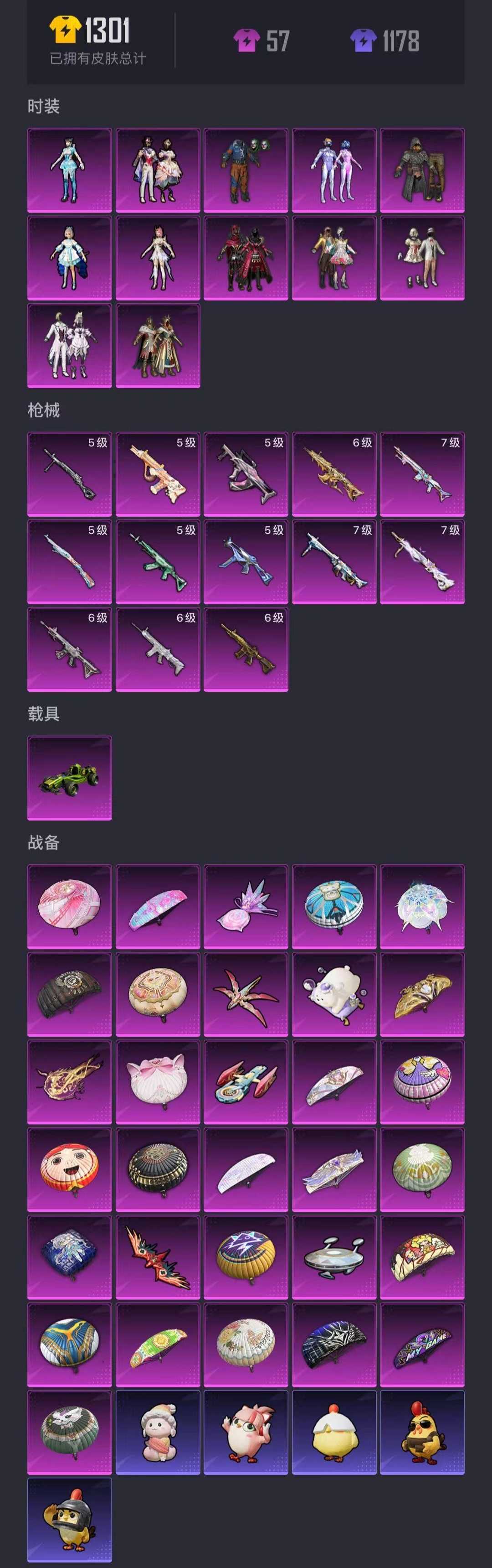 该号是男号喔~不要乱花军需币谢谢~ 套装233个,粉11个。 枪皮321个,特效枪13个。 装备414个,三级55个三级包53个。 载具皮肤1个。 降落伞112个,滑翔尾迹11个,动作87个。 祝您游戏愉快~请勿开挂谢谢宝宝~