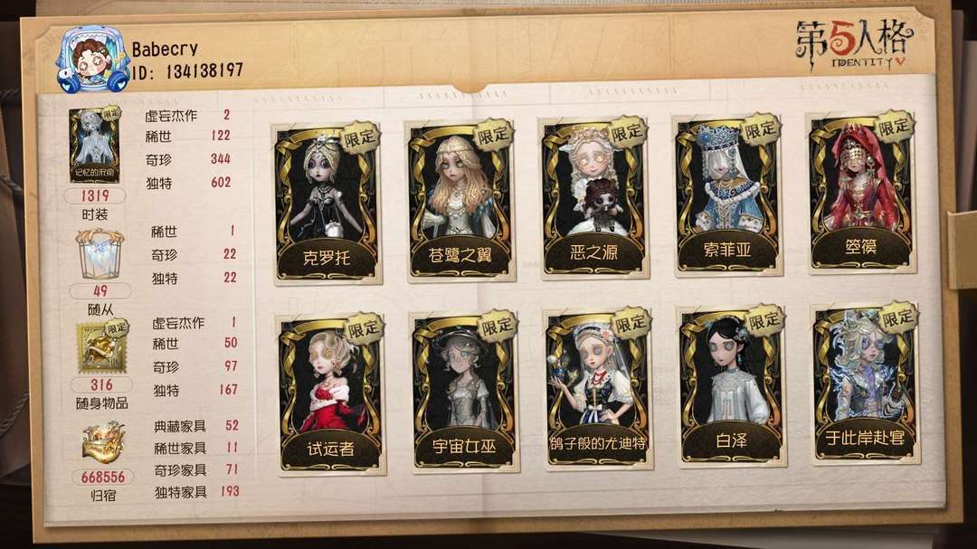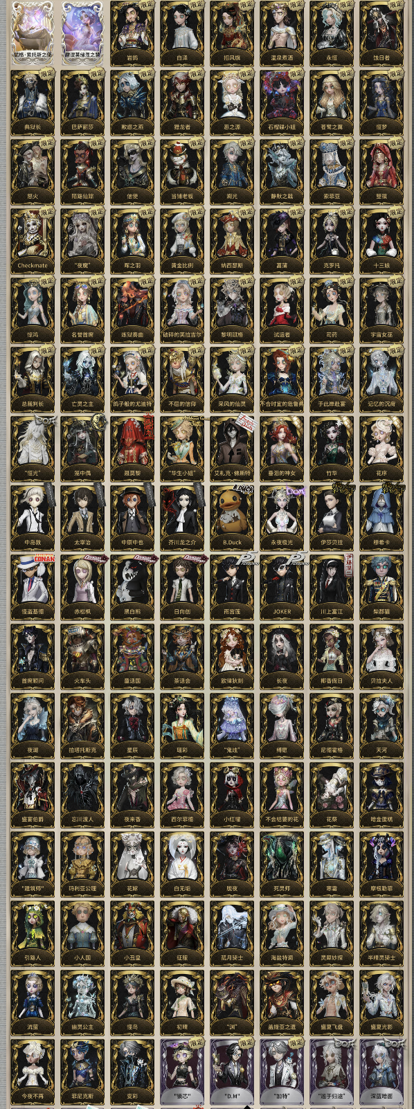 ✨亮点:调香虚妄/祭司虚妄/岩鸽/白泽/温泉煮酒/永恒/蚀日者/典狱长/巴萨丽莎/欺惑之燕/猎龙者/恶之源/石榴碟/苍鹭之翼/恒梦/怒火/陌路仙踪/信使/静默之戟/索菲亚/箜篌/Checkmate/“夜魔”/晖之羽/黄金比例/纳西瑟斯/菖蒲/克罗托/十三娘/惊鸿/名誉首席/炼狱奏曲/破碎的芙拉吉尔/试运者/司药/宇宙女巫/总裁判长/亡灵之主/鸽子般的尤迪特/采风的仙灵/不合时宜的危鲁弗/聂莫黎/“华生小姐”/札克/中岛敦/太宰治/中原中也/芥川龙之介/B.Duck/永夜极光/伊莎贝拉/穆希卡/怪盗基德/赤松枫/黑白熊/日向创/JOKER/DM/加特/黎明赋格/于此岸赴宴