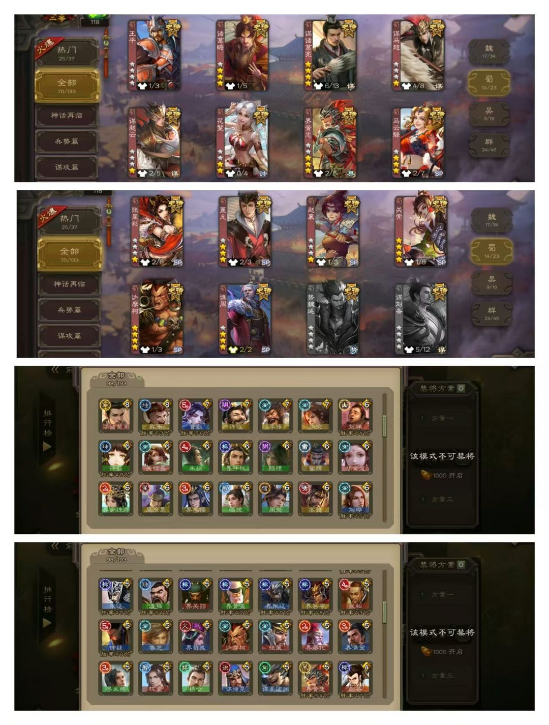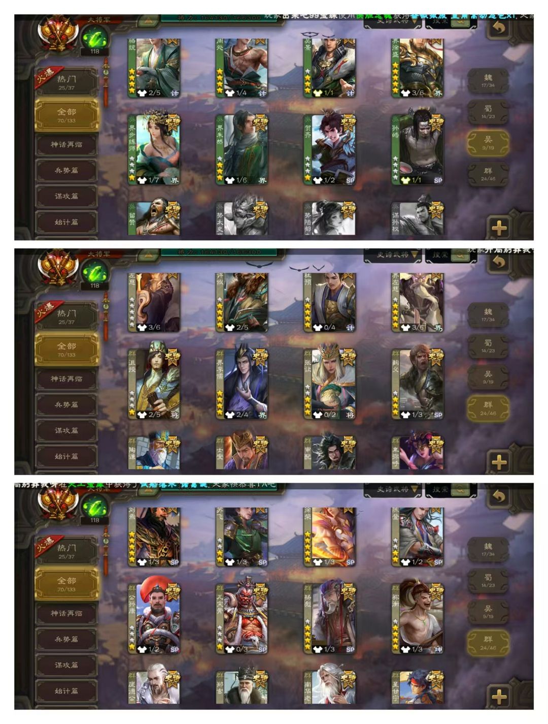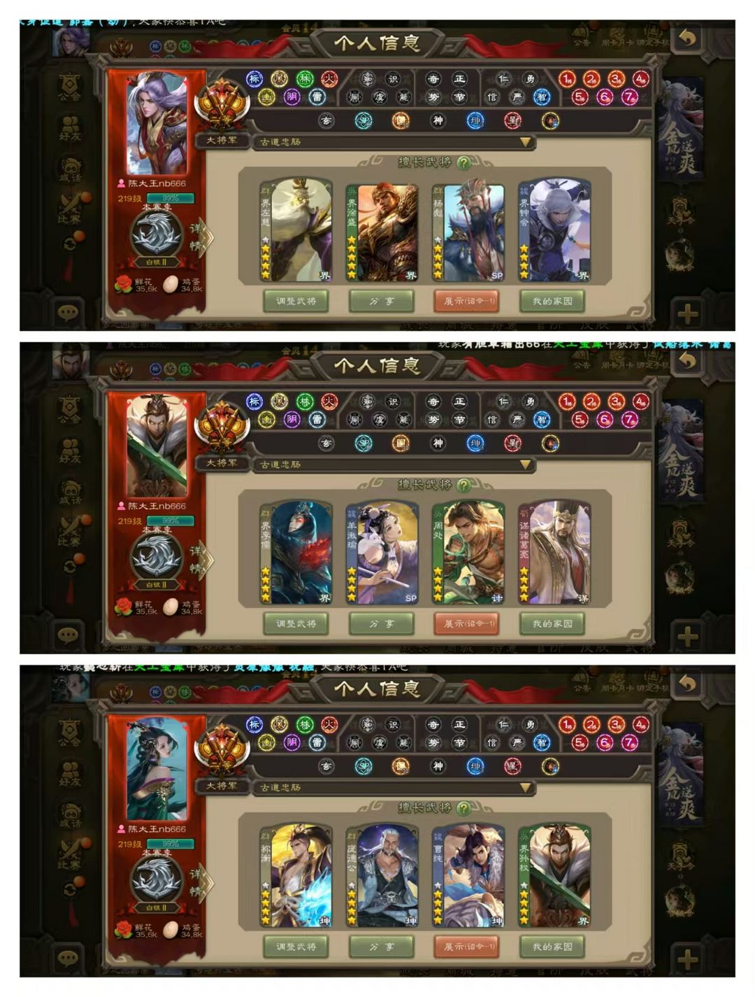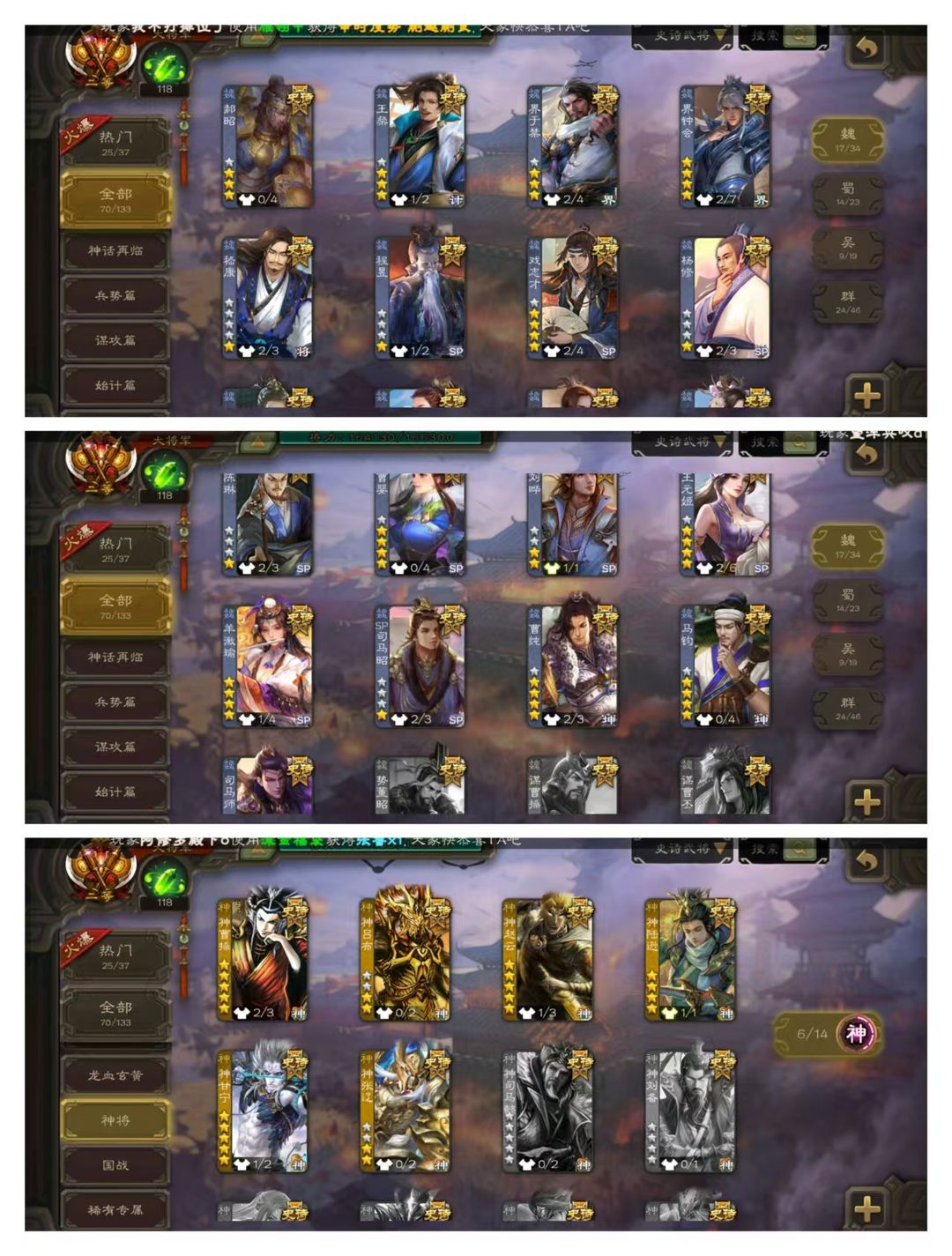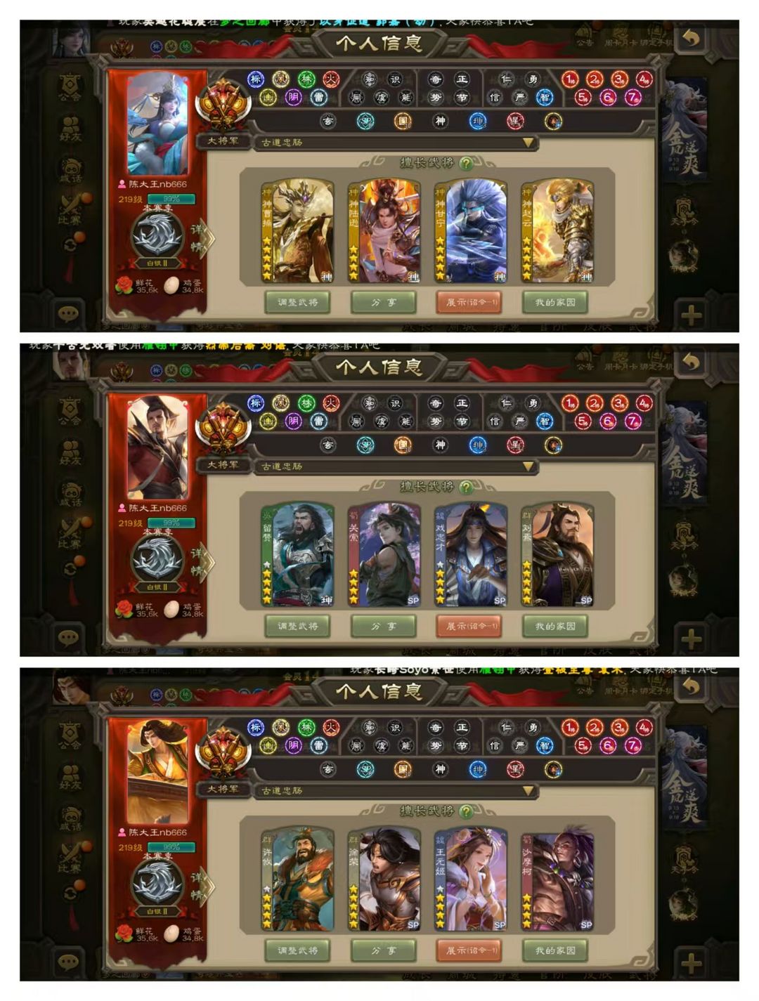 官方二等大将军,无卡,VIP14! 20四星玉龙:神曹操甘宁陆逊赵云动皮,动谋诸葛亮,刘焉徐荣羊徽瑜界左慈动皮,祢衡留赞许攸王元姬庞德公动皮,杨彪金皮,杜预曹婴界徐盛! 70史诗武将,秦宓界李儒戏志才星甘宁动皮,马钧郑玄周处界徐盛钟会等! 54动皮119金皮213国战皮肤!