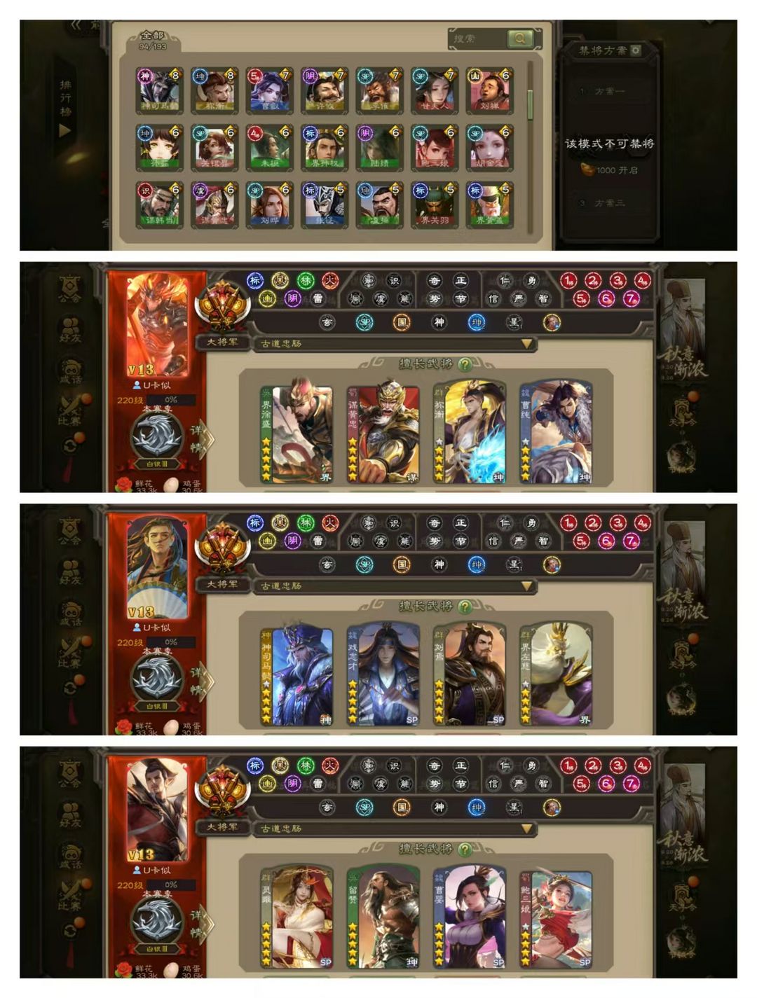 官方二等大将军,无卡,VIP13! 7五星炎龙:刘焉灵雎曹婴戏志才留赞动皮! 15四星玉龙:界左慈曹纯祢衡动皮,鲍三娘马钧王元姬张琪瑛,金谋黄忠,界沮授卑弥呼神司马懿! 52史诗武将,张让金皮,神赵云陆逊关索张星彩庞德公界徐盛! 44动皮81金皮154国战皮肤!