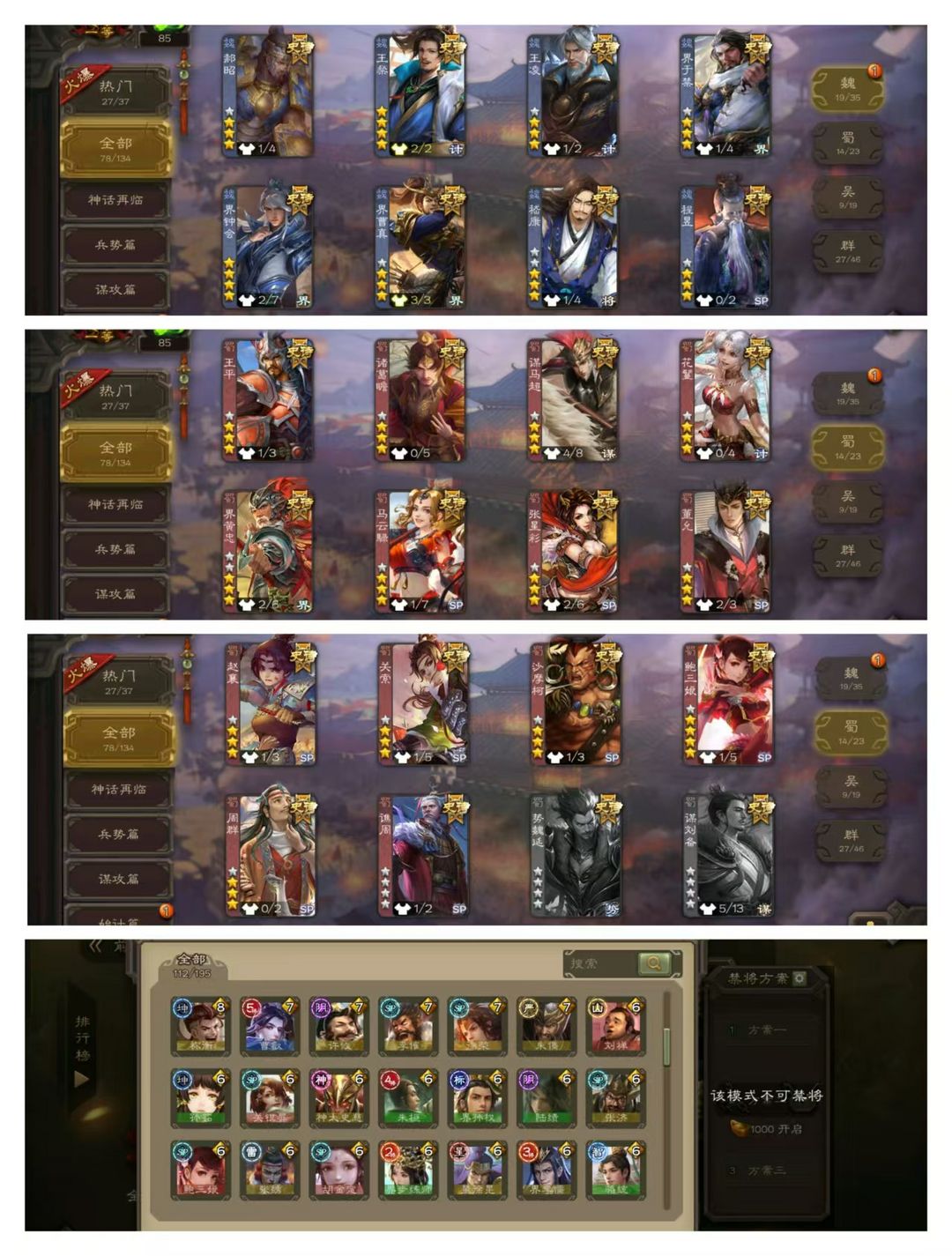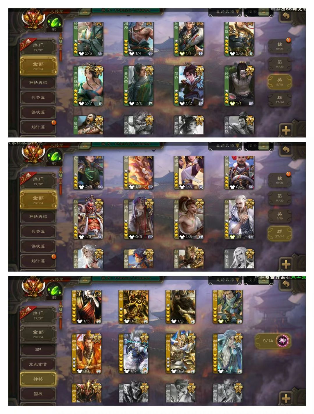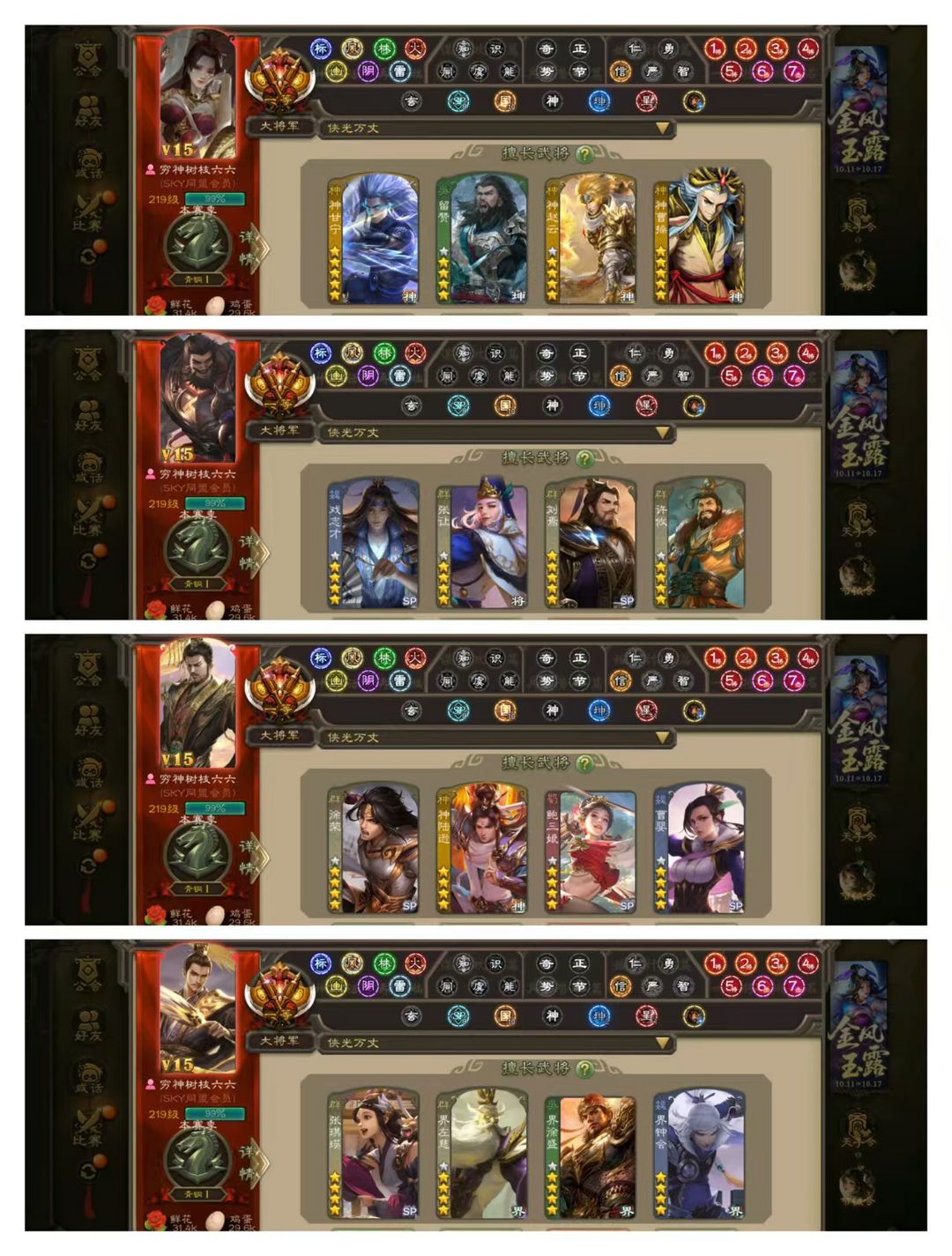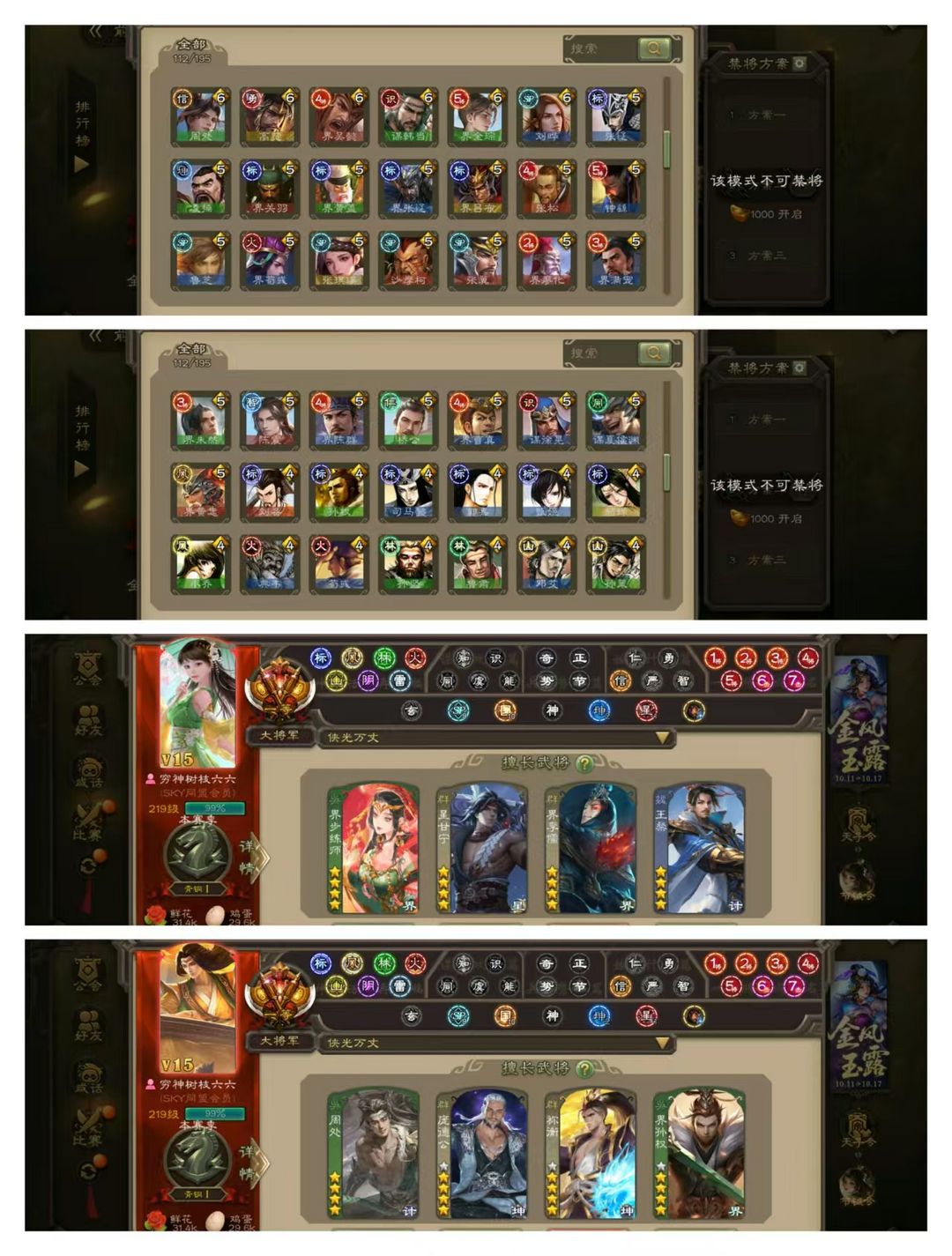 官方一等大将军,无卡,VIP15! 3五星炎龙:动刘焉! 43四星玉龙:动灵魂歌王留赞,动神甘宁动神赵云动神陆逊动庞德公,动徐荣动许攸动戏志才动曹婴,动张琪瑛动界左慈动界钟会动祢衡,动星甘宁动王璨动界步练师动界李儒,金神曹操金鲍三娘,神郭嘉马钧王元姬杨彪杜预,南华老仙界徐盛羊徽瑜周处! 78史诗武将,动卑弥呼,神太史慈司马徽司马昭刘璋! 62动皮112金皮185国战皮肤!