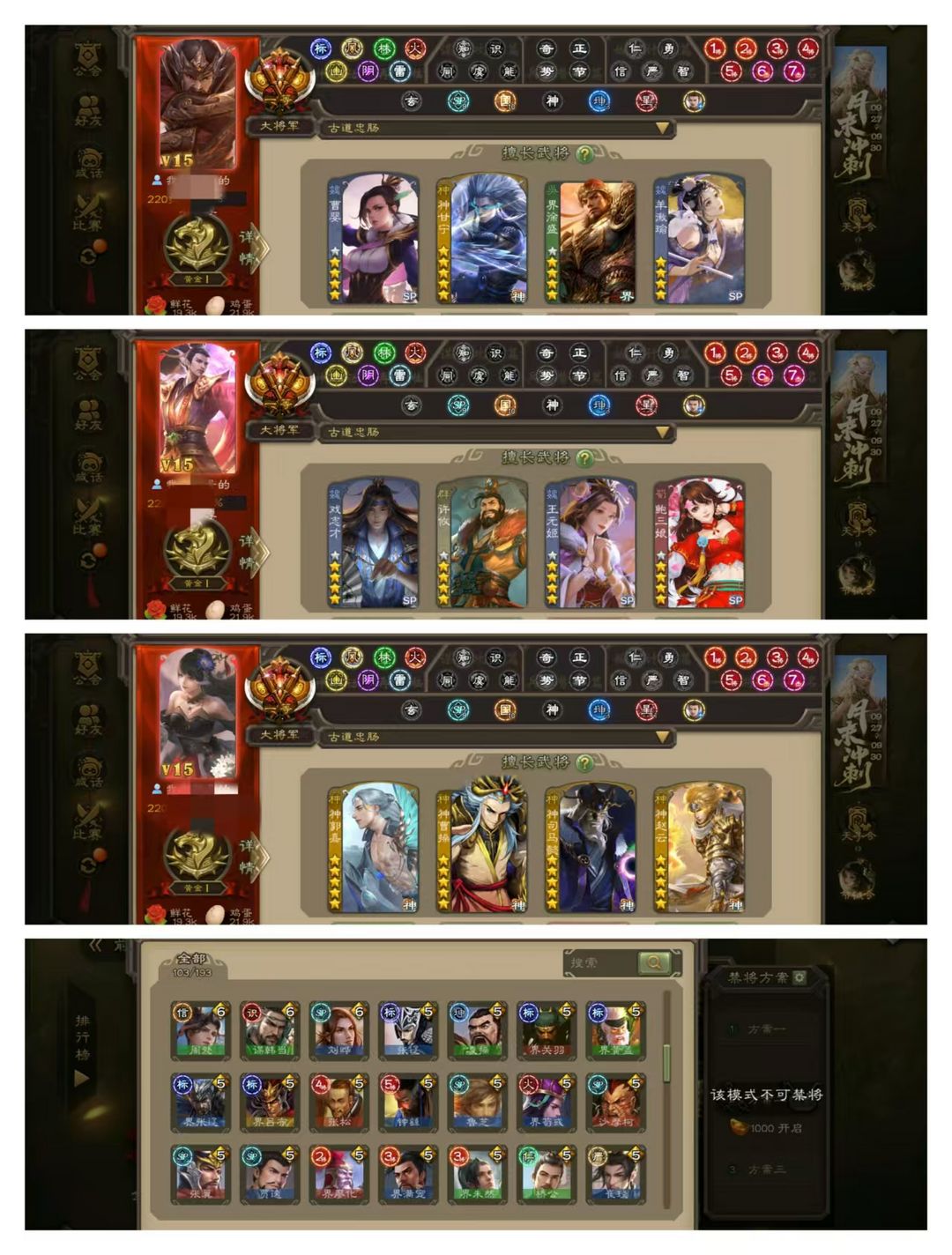 官方一等大将军,无卡,VIP15! 8五星炎龙:动神甘宁动神赵云动界孙权,金神曹操,神郭嘉! 20四星玉龙:动神司马懿动戏志才动许攸,动王元姬动鲍三娘动曹婴动羊徽瑜,金界徐盛,友诸葛亮谋关羽徐荣马钧留赞祢衡庞德公! 75史诗武将,动司马昭动卑弥呼,杨彪杜预南华老仙星甘宁,界钟会司马师周处神陆逊郑玄等! 66动皮126金皮190国战皮肤!