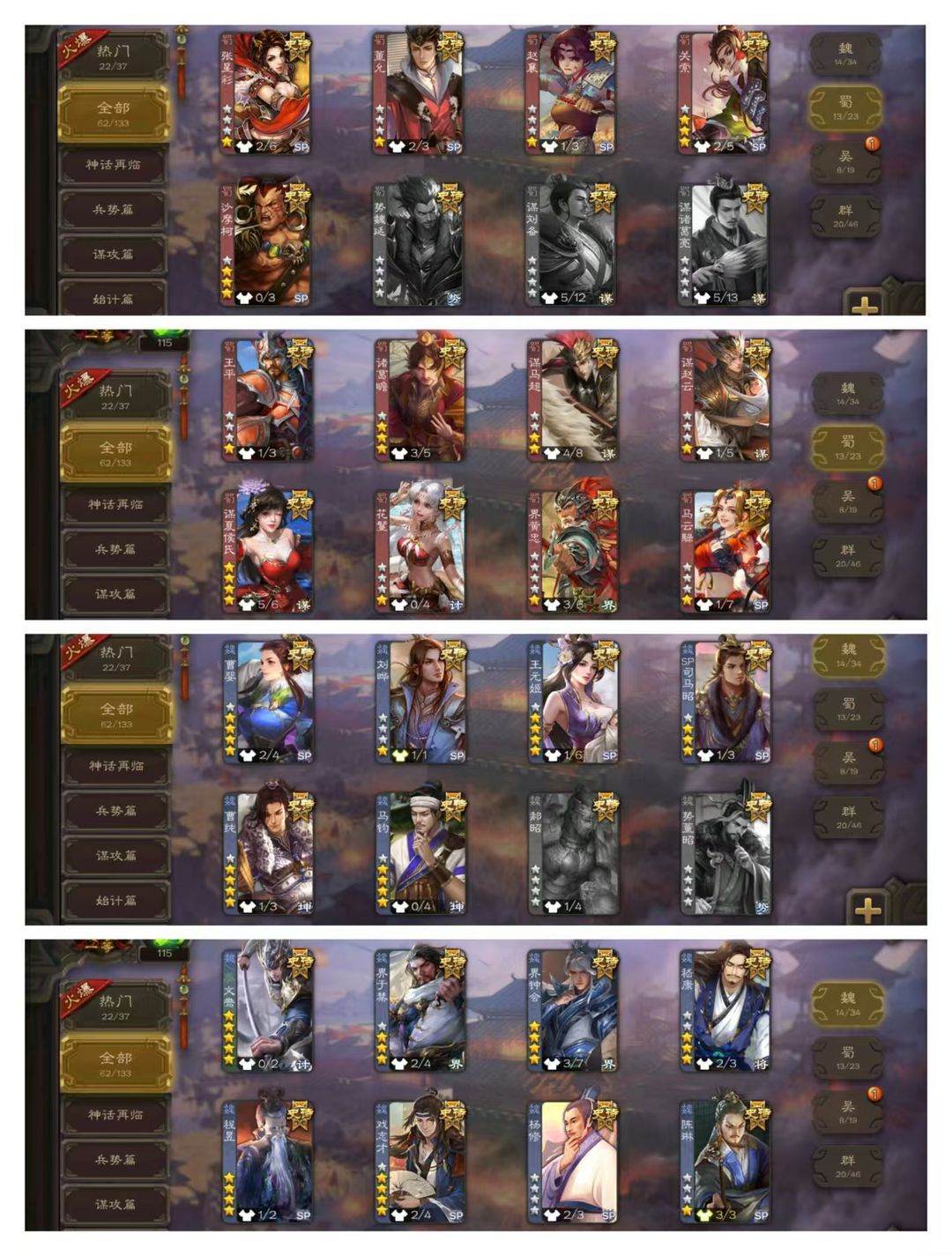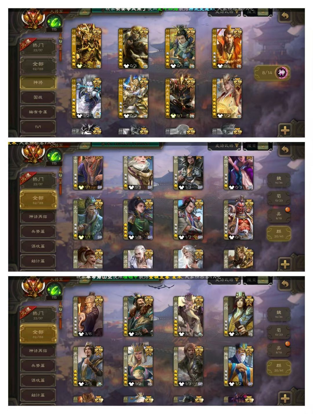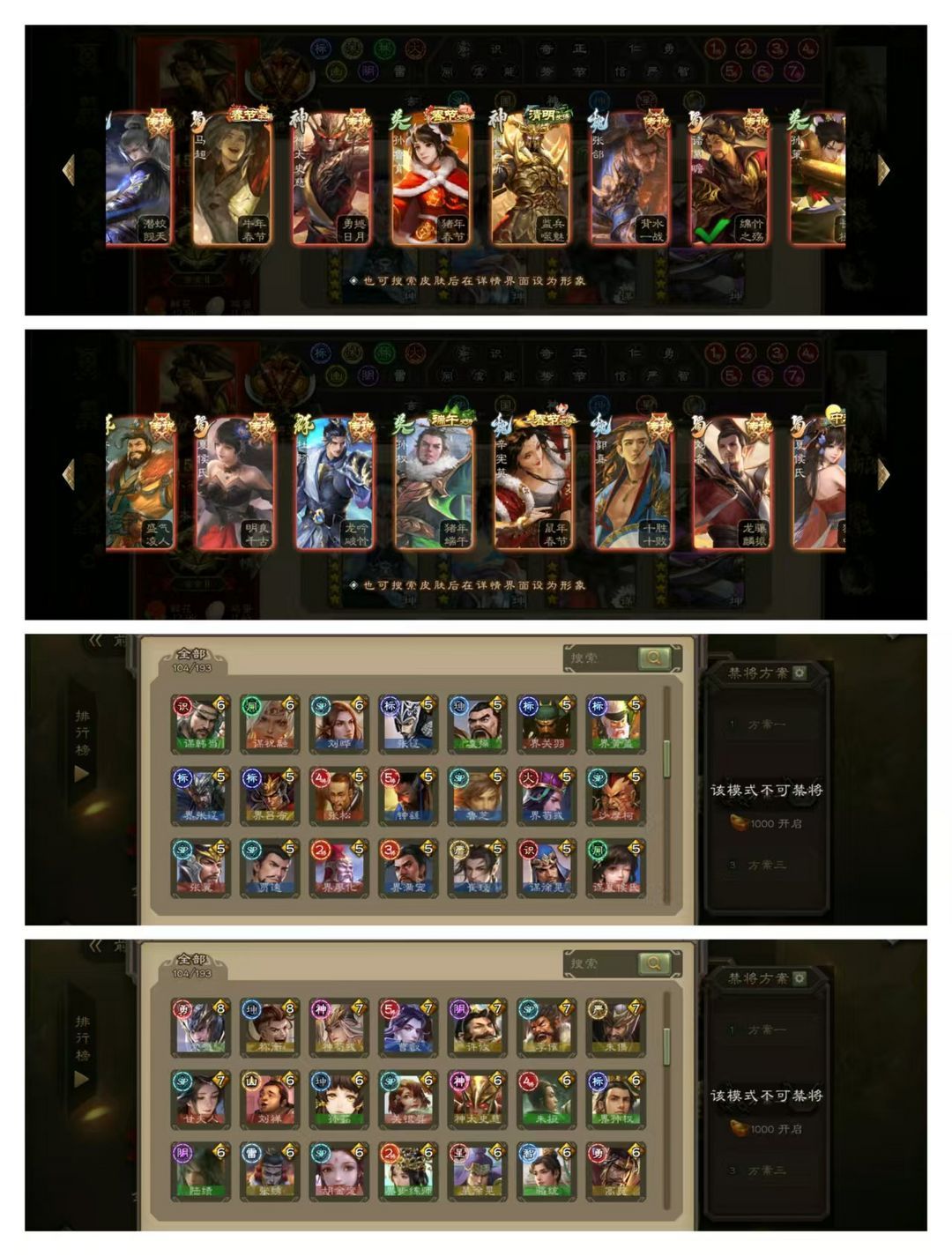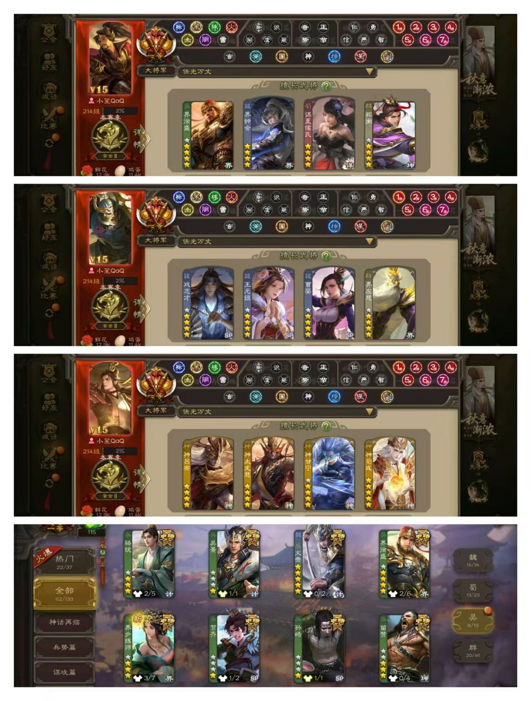 官方一等大将军,无卡,VIP15! 24四星玉龙:回廊双形态动界钟会,回廊动神太史慈,冠绝天下动神吕布,动神荀彧动神甘宁动戏志才动王元姬,动曹婴动界左慈动庞德公动程煜动曹纯,金祢衡,文鸯界徐盛苏飞! 62史诗武将,动谋夏侯氏动许攸,界沮授马钧南华老仙神赵云神陆逊等! 65动皮150金皮230国战皮肤!