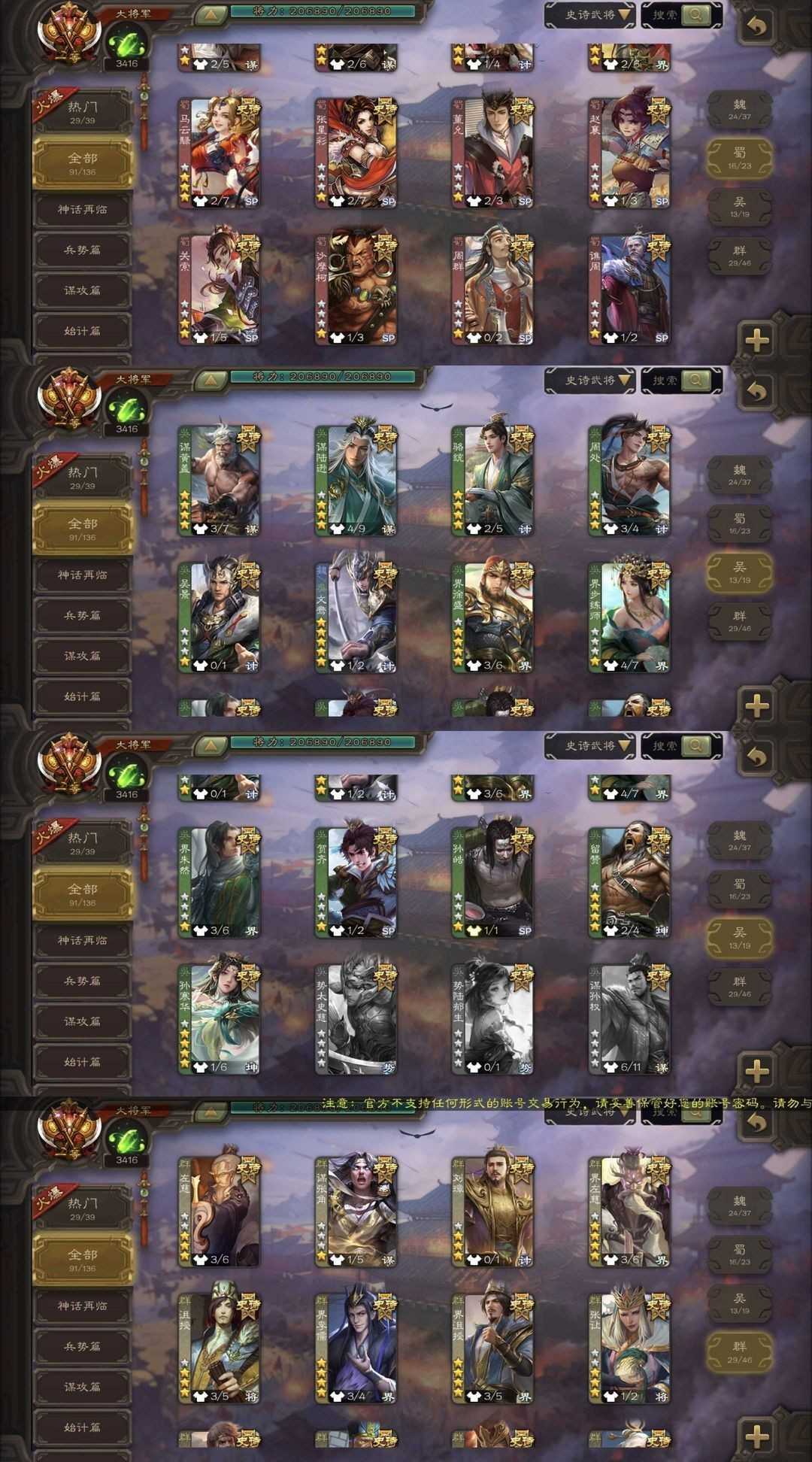 ✨感谢将军们对小店的厚爱~✨ 温馨提示:一、所有账号均为游卡官方版本,安卓苹果都可登录 二、所有账号【有卡】标记均三卡充足;【有点将卡】标记均只有点将卡充足。 三、郑重承诺:出租时间到时会改密,但小店20分钟内绝不顶号!(20分钟到时会顶号,建议兄弟合理安排时间,以防影响游戏体验,见谅!) 四、遇到游戏登录不上的情况,先把移动数据关掉再打开即可 !五、手杀新增逃跑封号机制,为了能够持续给大家提供优质服务,小店对于恶意逃跑者永久拉黑并举报平台封禁账号,望大家理解。 最后祝大家身体健康,玩的愉快!!本小店可以收藏哦!!